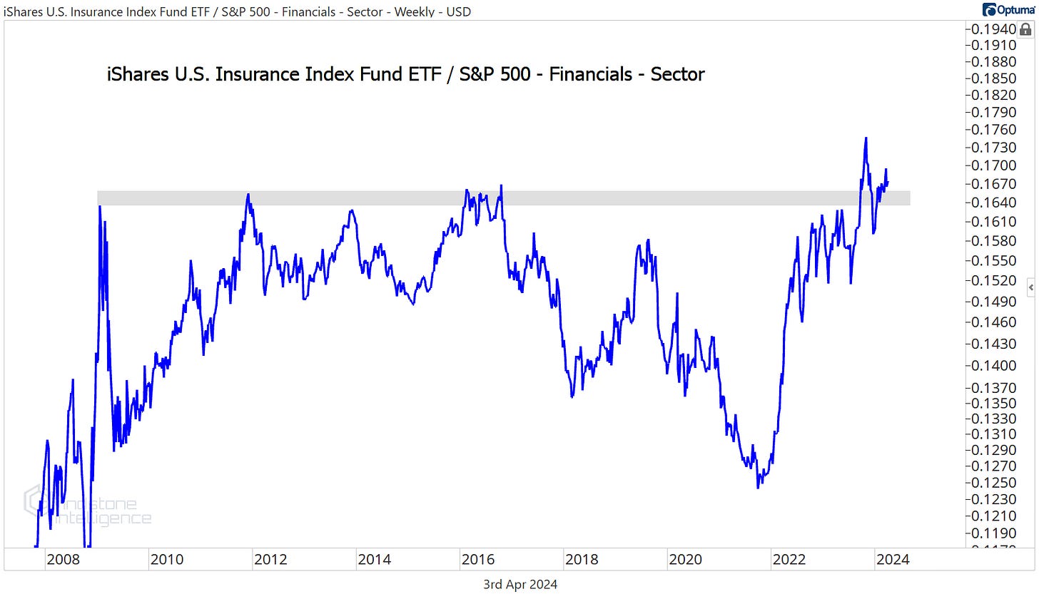 More impressive than the steady strength this year is the massive 15-year base for IAK - the iShares Insurance ETF - relative to the rest of the sector. If insurance stocks are above their 2009 highs vs. the Financials, how can we not be buying them?