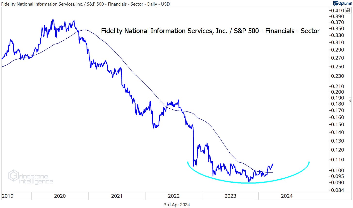 It’s been one of the worst stocks in the world over the past few years, but compared to the S&P 500, FIS stopped going down last fall. And the FIS/SPX ratio is further above its 200-day right now than at any point since March 2020.