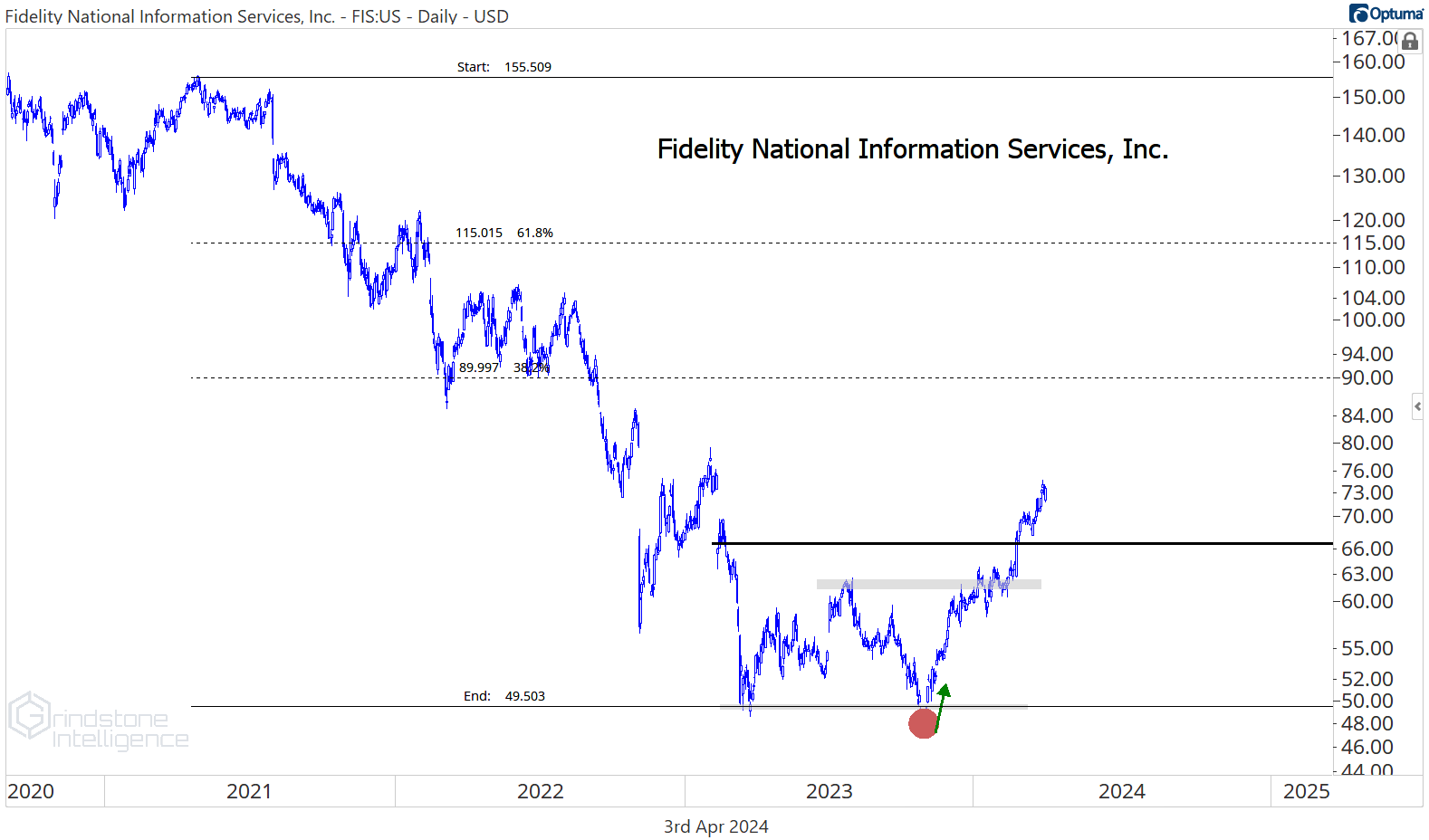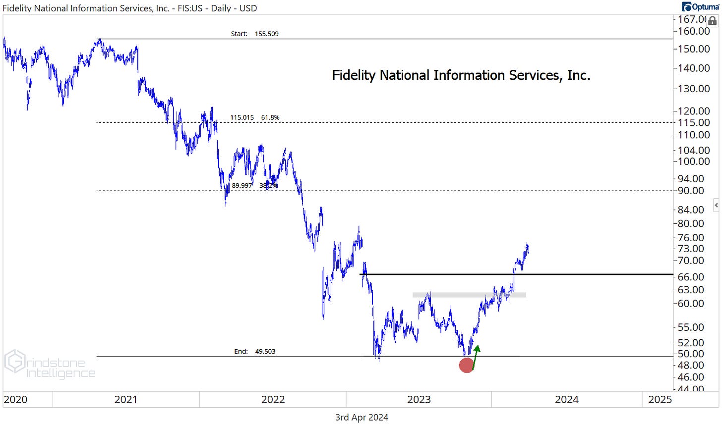 On an absolute basis, the downtrend reversal is even further underway. We continue to like FIS above $63 with a target of $90, which is the 38.2% retracement from the entire 3 year decline.