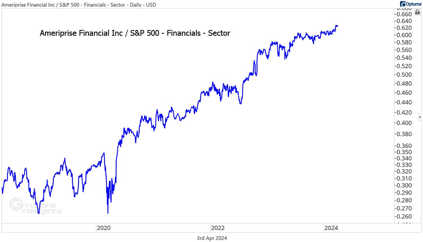 Ameriprise has been a monster. It’s setting new highs relative to the rest of the sector, and it’s been doing so steadily for the last few years.
