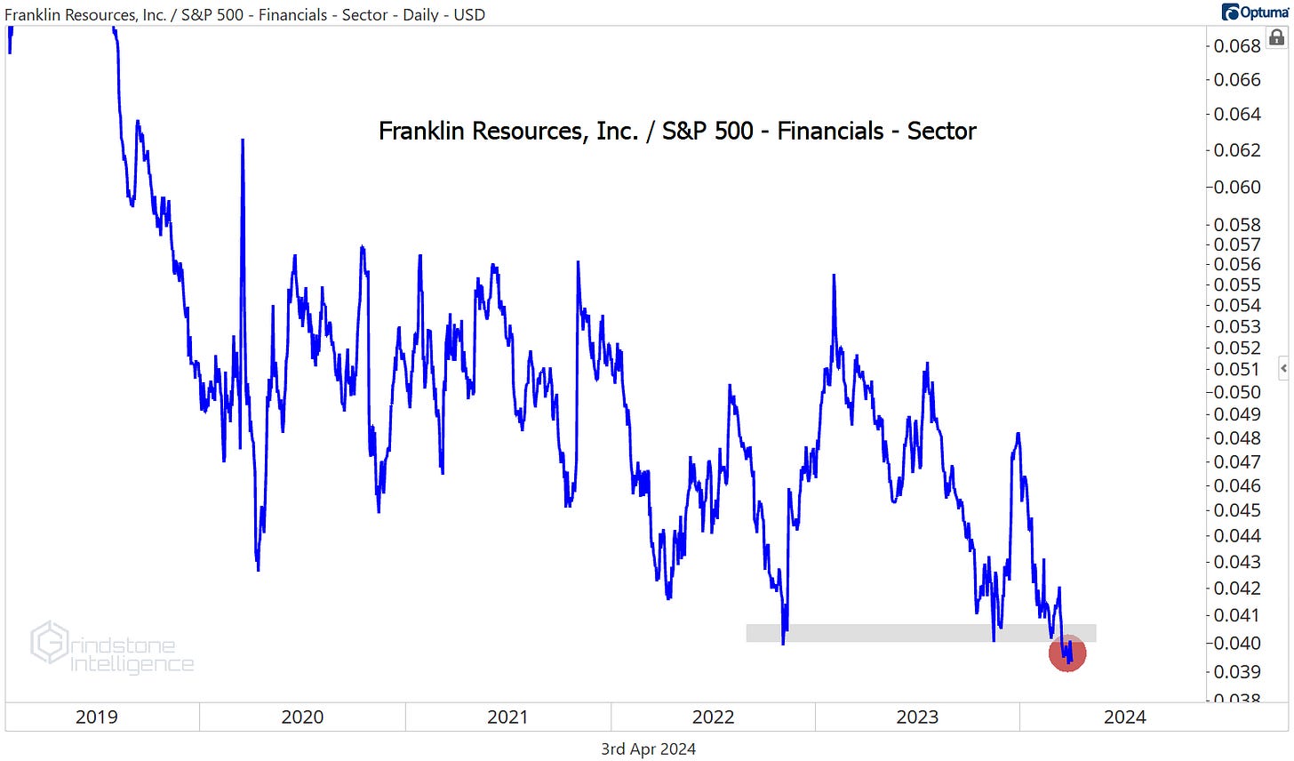 Franklin Resources has lost 80% of its value when compared to the rest of the sector over the 13 years, and it just hit new 20-year relative lows.