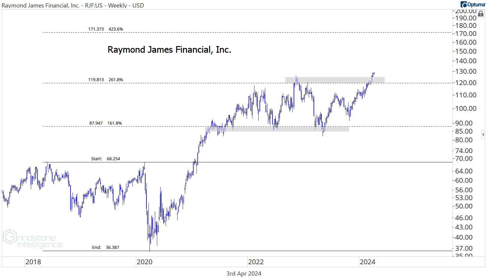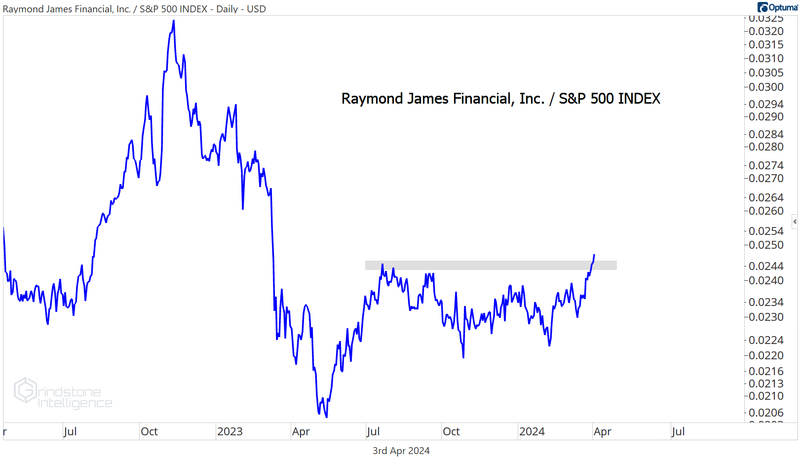 This basing action versus the rest of the S&P 500 is the most interesting part, though. RJF is setting new 52-week relative highs.