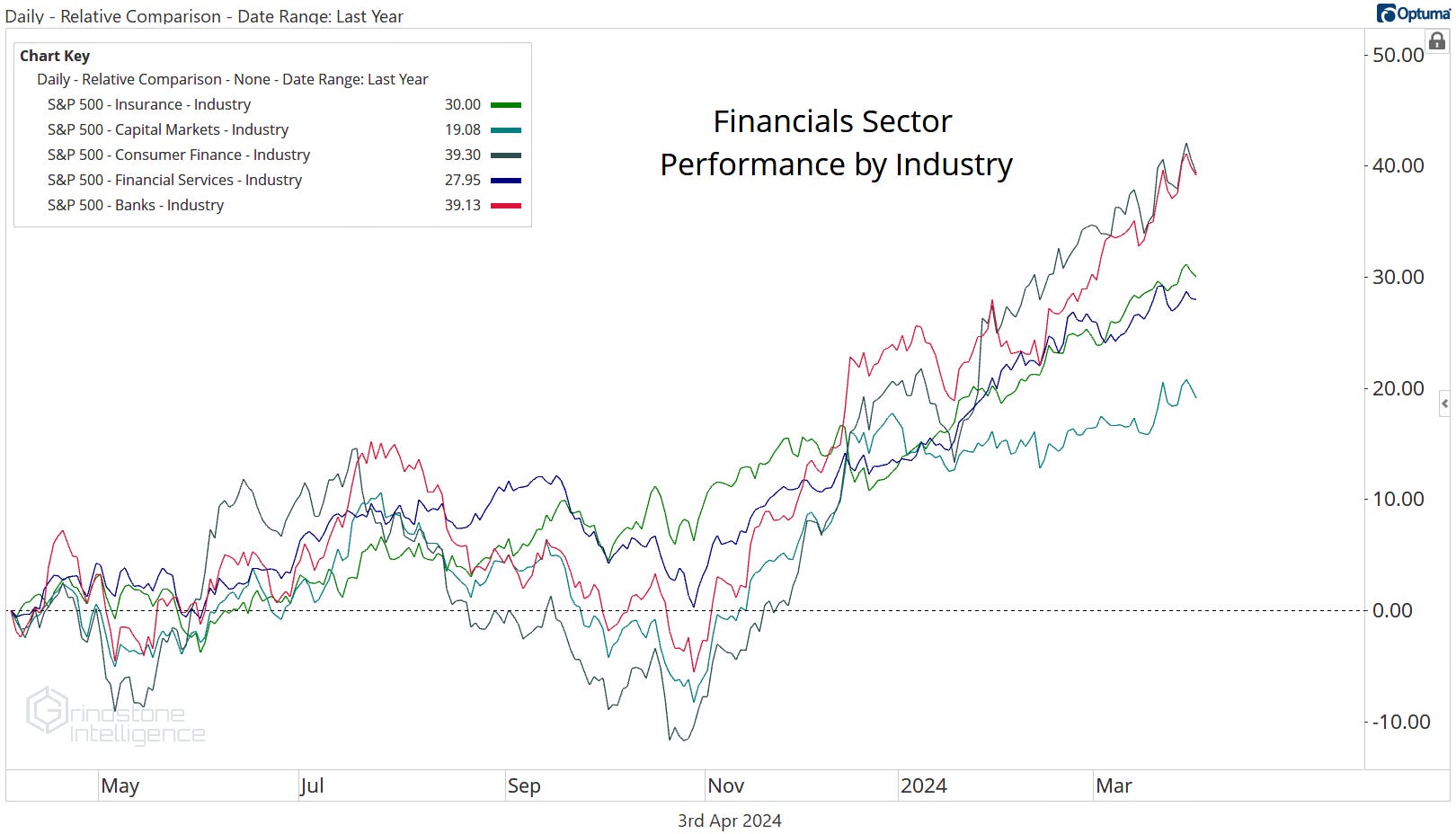 Often when we look at industry performances within a sector, we see a wide disparity in outcomes - some groups might see huge gains, while others end up in the red. With the Financials, that’s not the case. All five industries have gained at least 19% over the past year, and none have risen more than 40%.