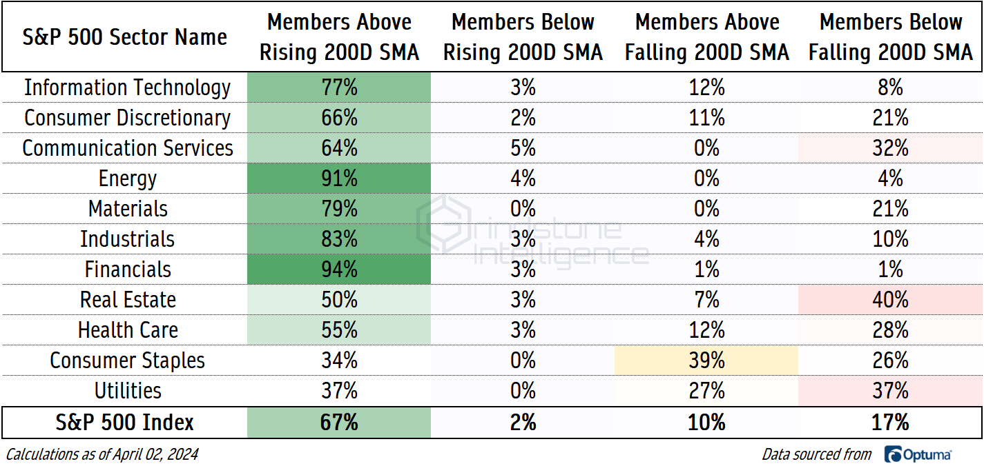 And in bull markets like this, most stocks tend to go up. Nowhere is that more true than in the Financials sector. Today, 94% of S&P 500 Financials sector stocks are trading above a rising 200-day moving average. Other value-oriented sectors - Energy, Industrials, and Materials - aren’t far behind.