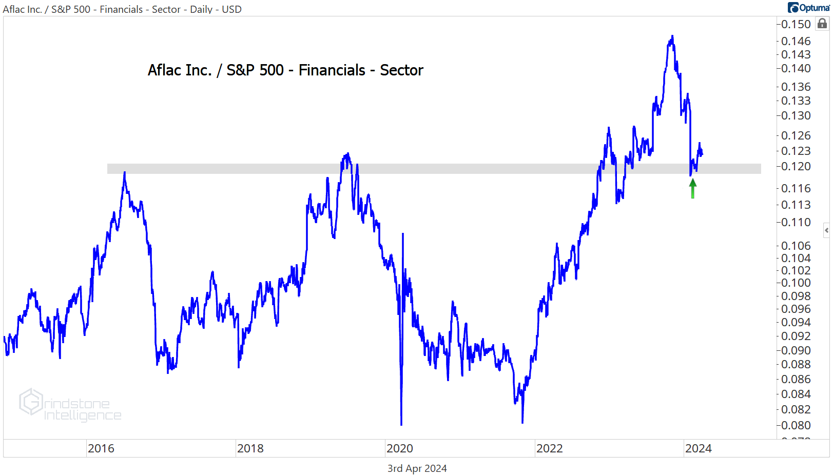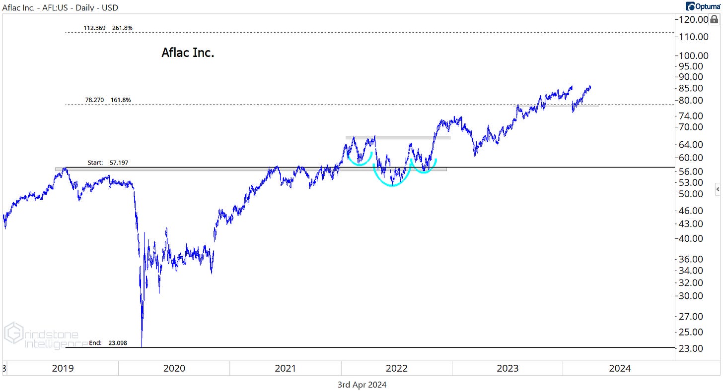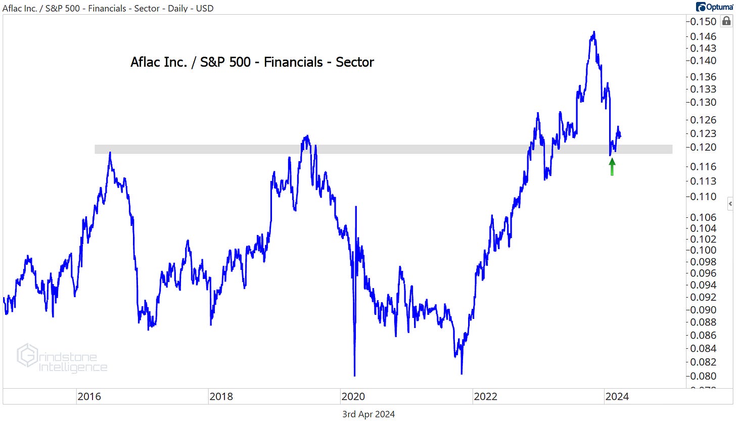Aflac is another great one. On a relative basis, AFL just pulled all the way back to its 2016-2021 highs. Pullbacks within longer term uptrends always get us excited.