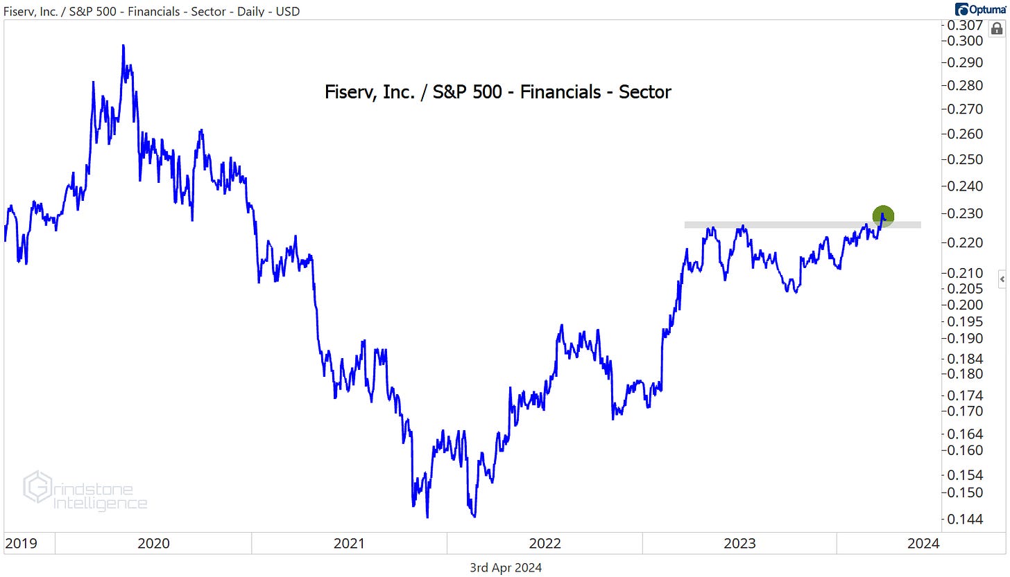 As you might have guessed, FI has been on our radar because it’s showing relative strength. Compared to the rest of the sector, it just broke out of a 12-month base.