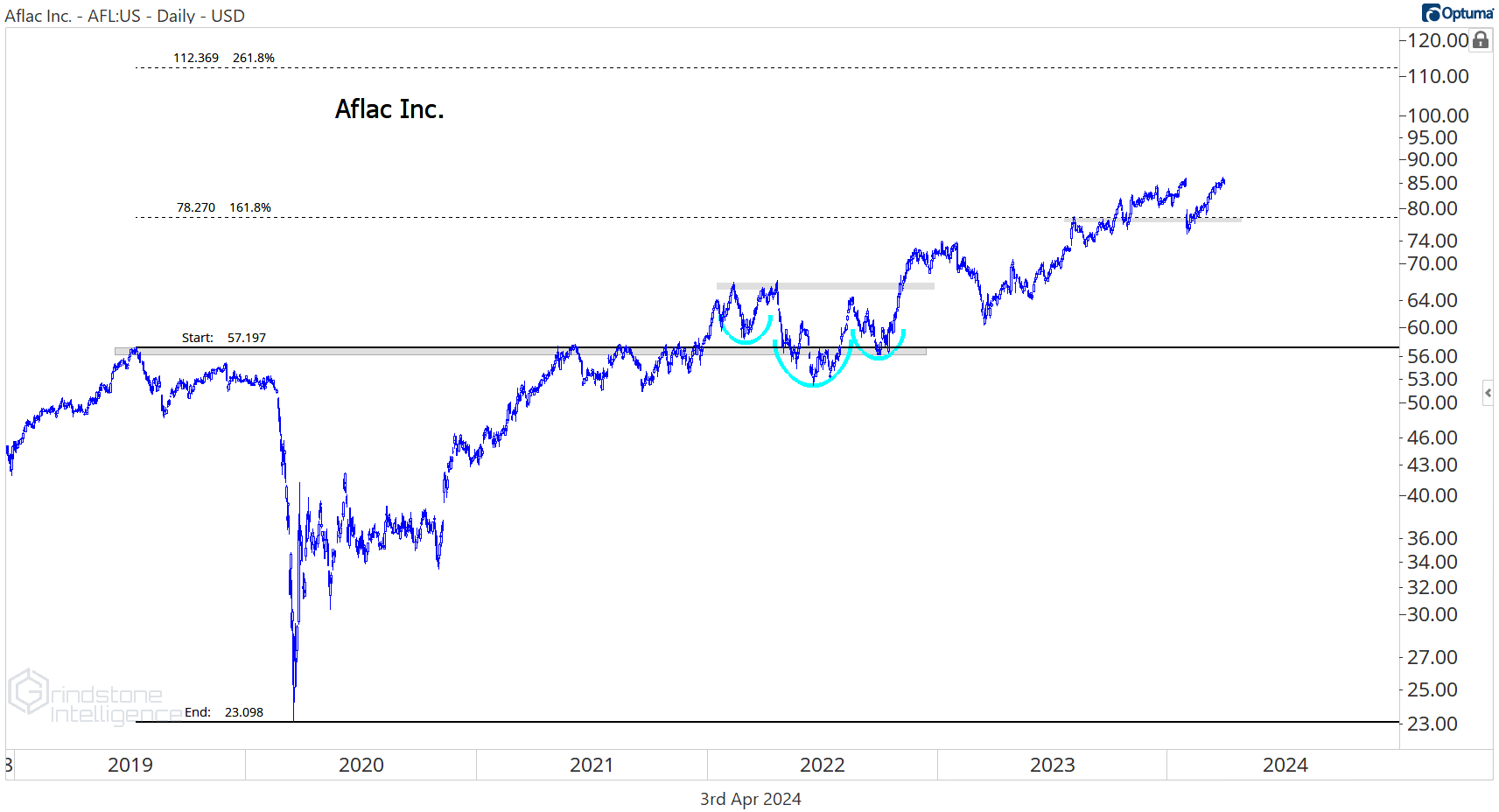 Especially when the uptrend on an absolute basis remains as healthy as this one does. AFL has been consolidating above the 161.8% retracement from the 2019-2020 decline, which gives us a great risk/reward setup from the long side. We like it above $78 with a target up at $112.