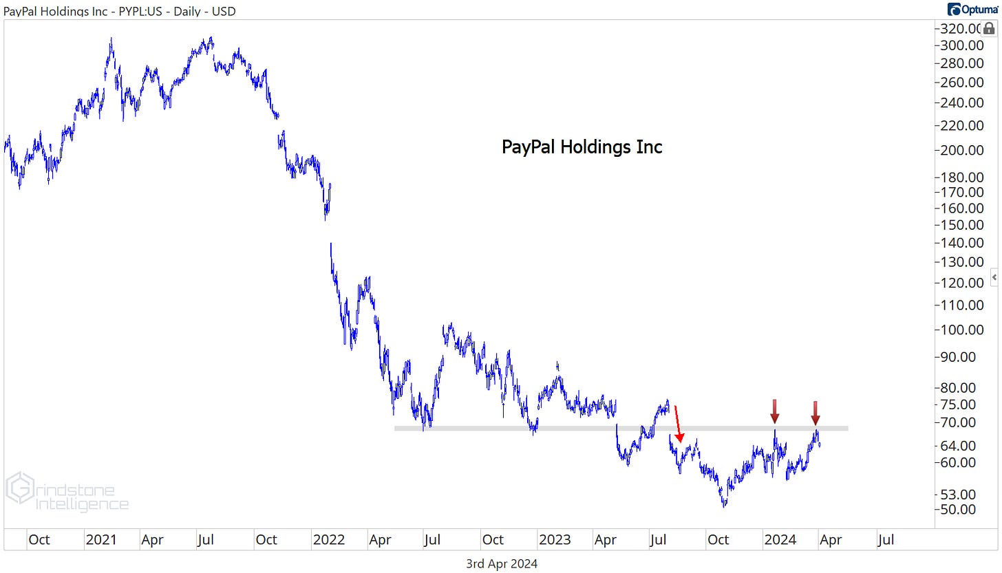 We like buying pullbacks in uptrends, but we want to avoid buying rallies within downtrends. That’s what we’re seeing in PayPal. It jumped 11% over the last 4 weeks, but the stock is still stuck below resistance from the 2022 lows.