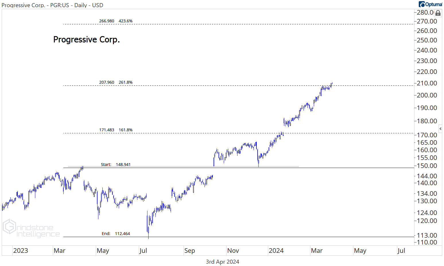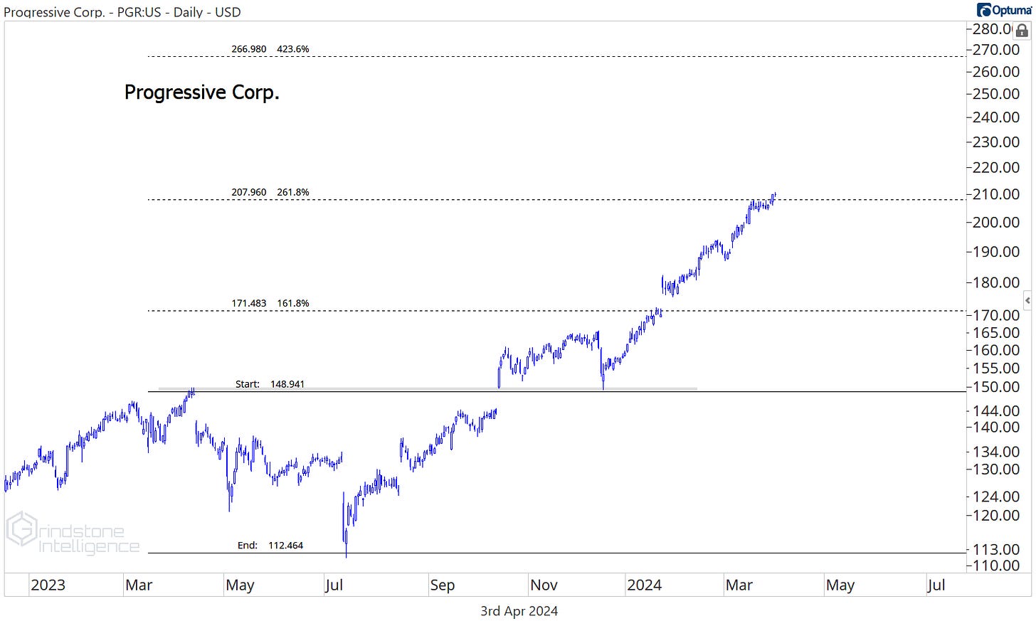 Progressive is much cleaner. It just moved past our former target of $205, and now we can reset and use that level to manage risk on new entries. We like PGR long above $205 with a target of $265.