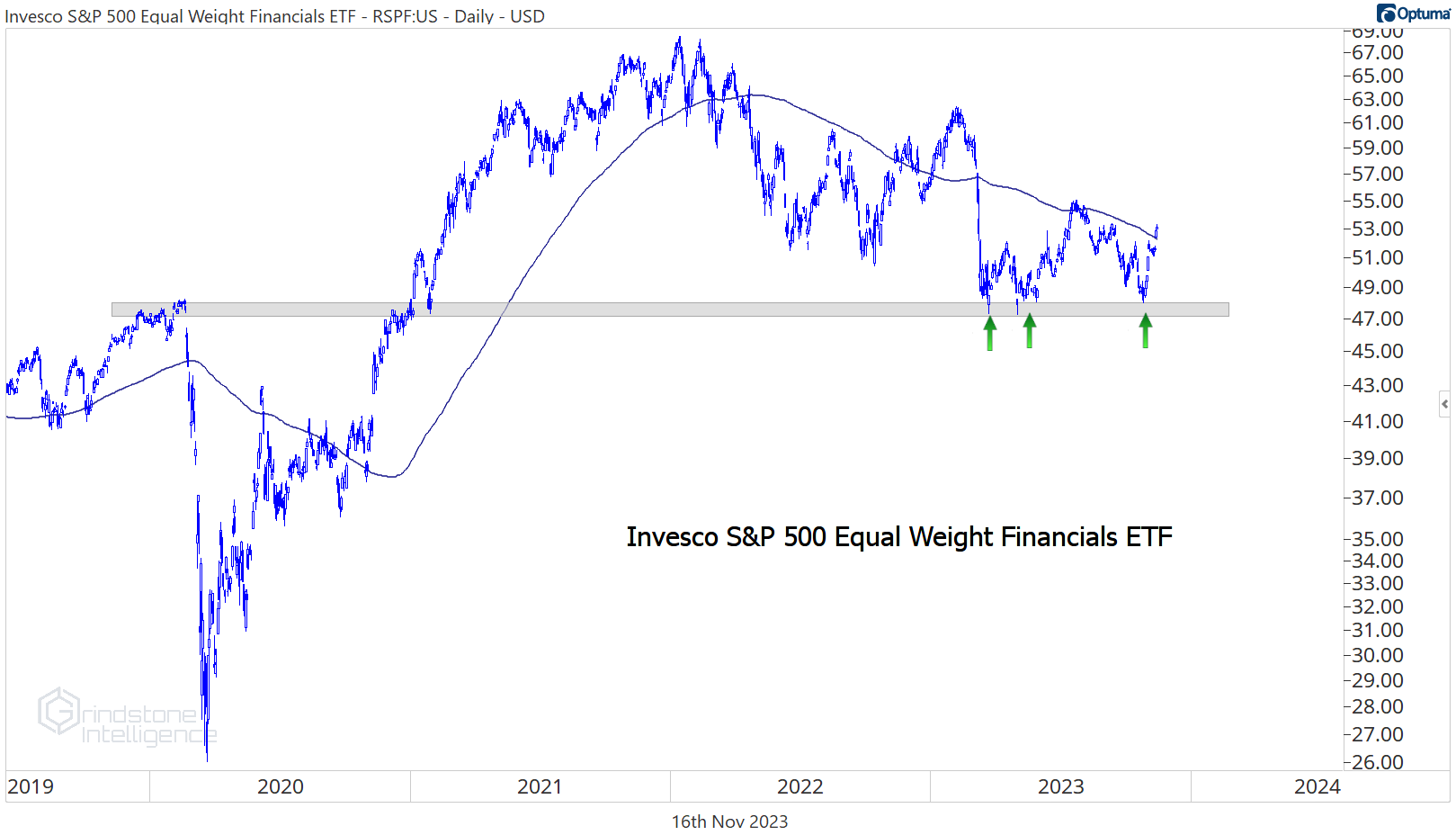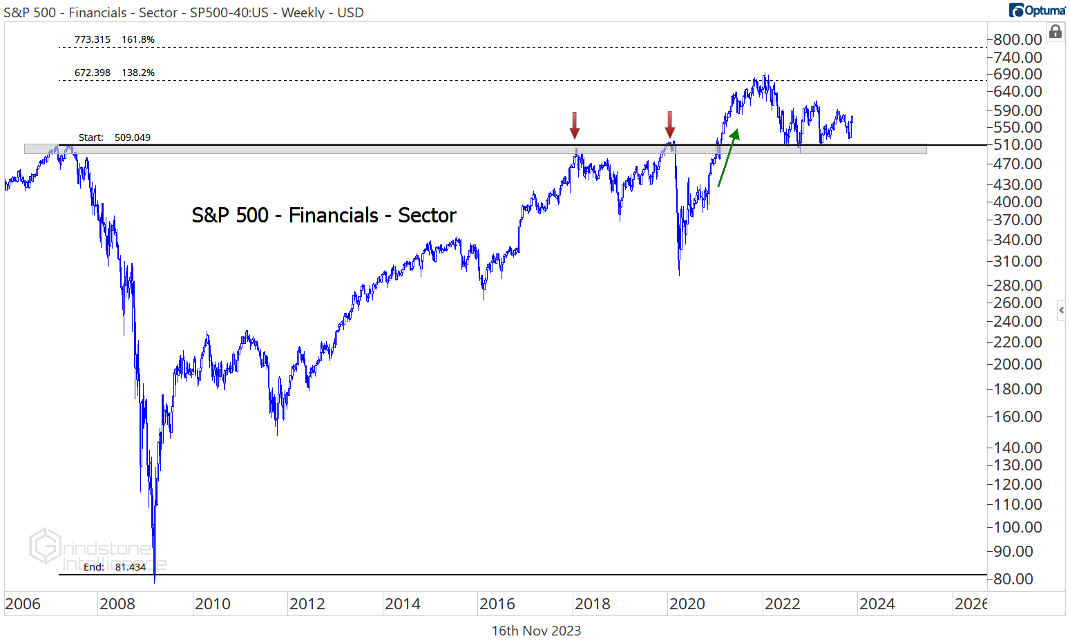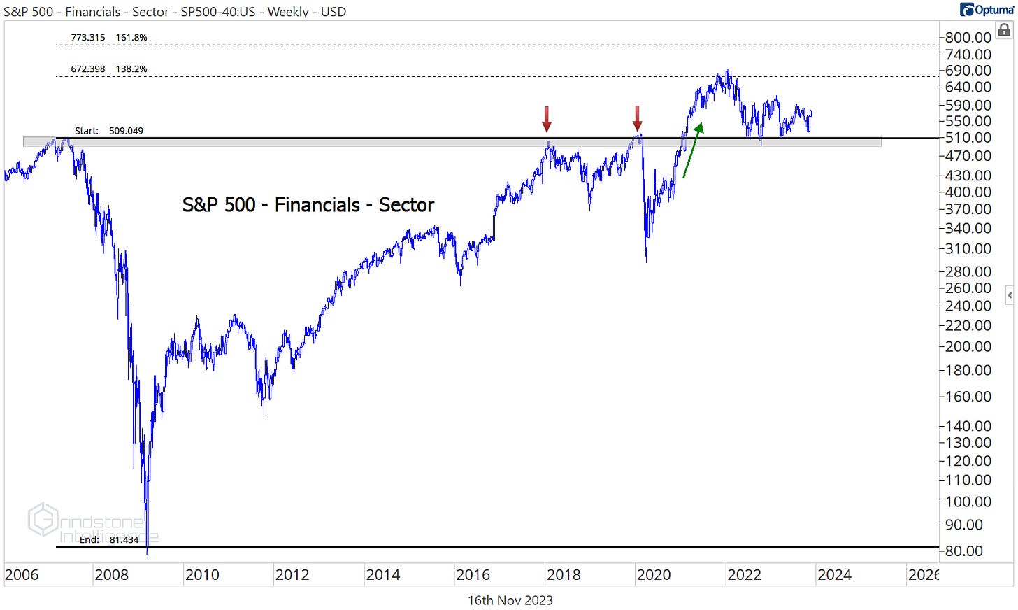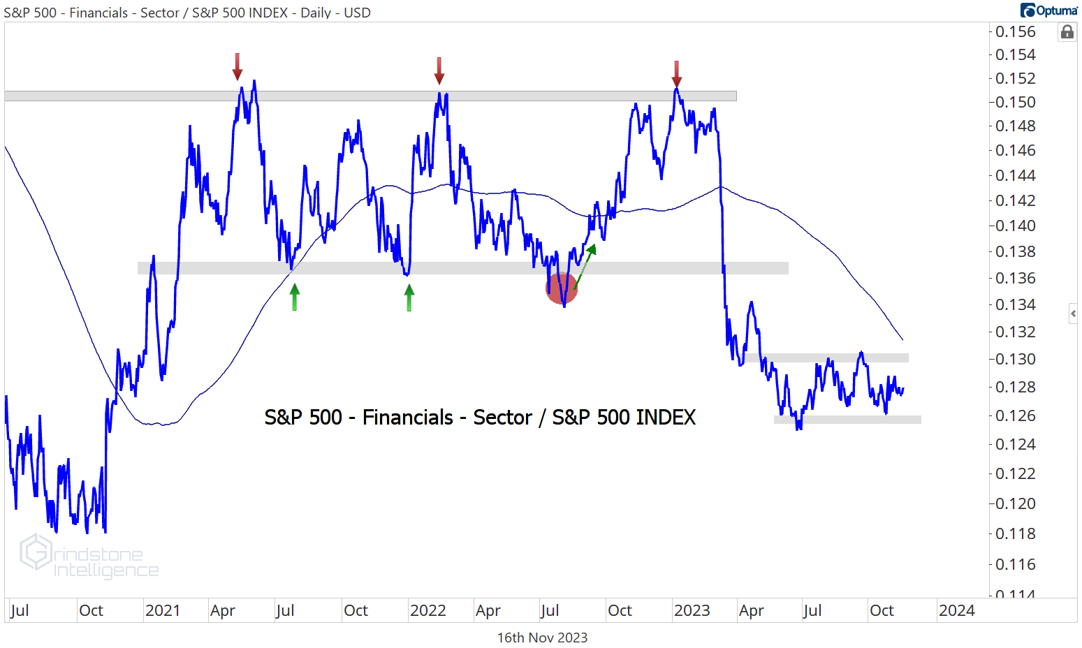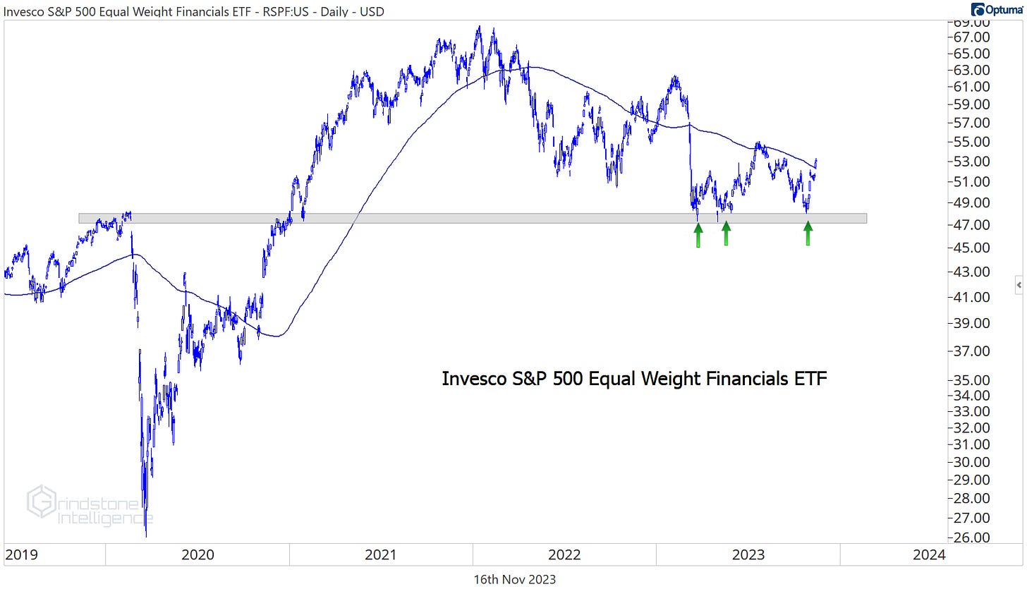 The same goes for Financials on an equal weight basis. Our line in the sand here is the pre-COVID highs. If we’re below that, the overall market is probably under pressure, and we’ll probably be looking for a lot of short opportunities. And in that scenario, Financials are probably leading on the downside. But that’s not the environment we’re in right now.