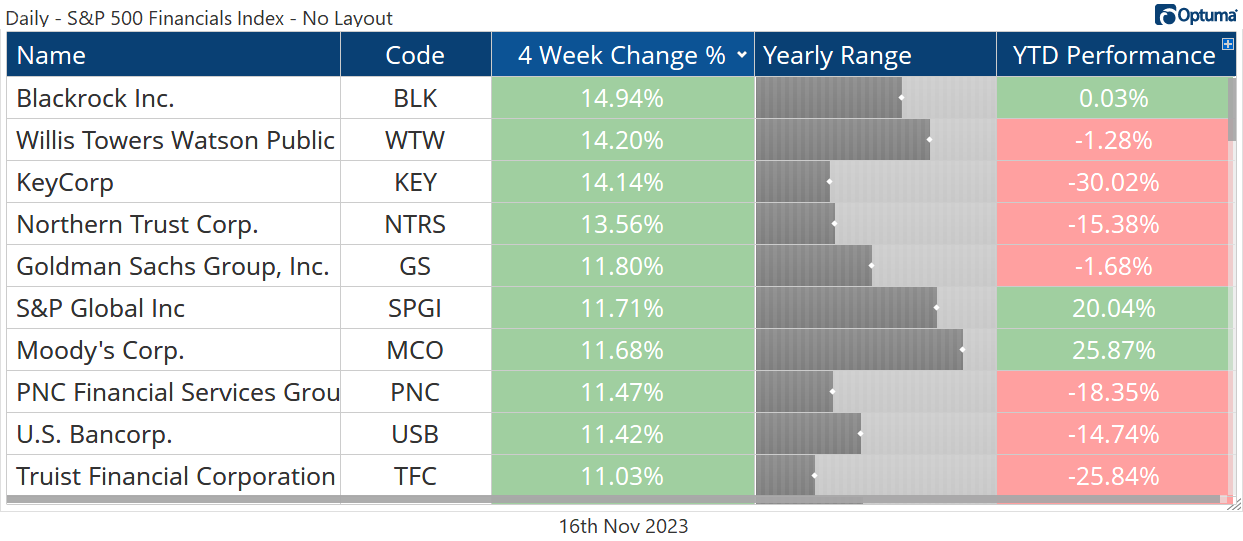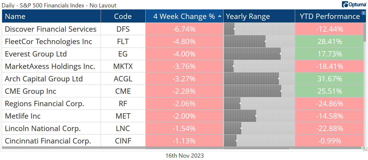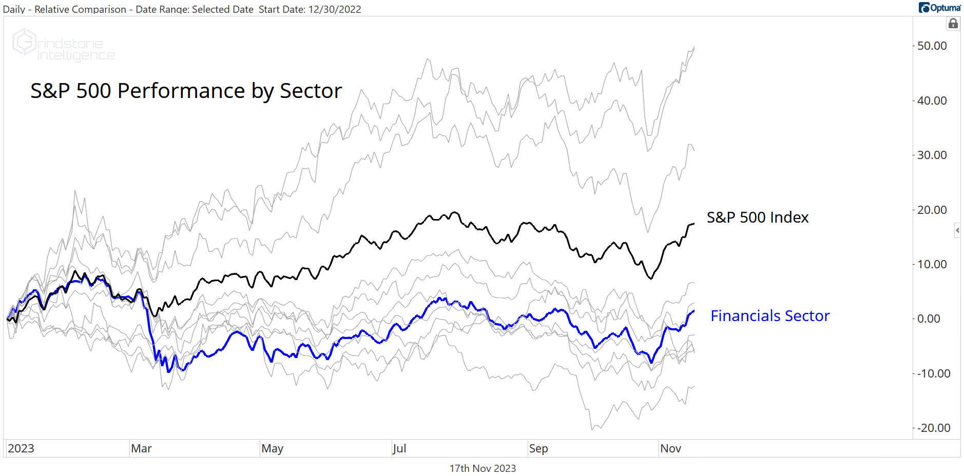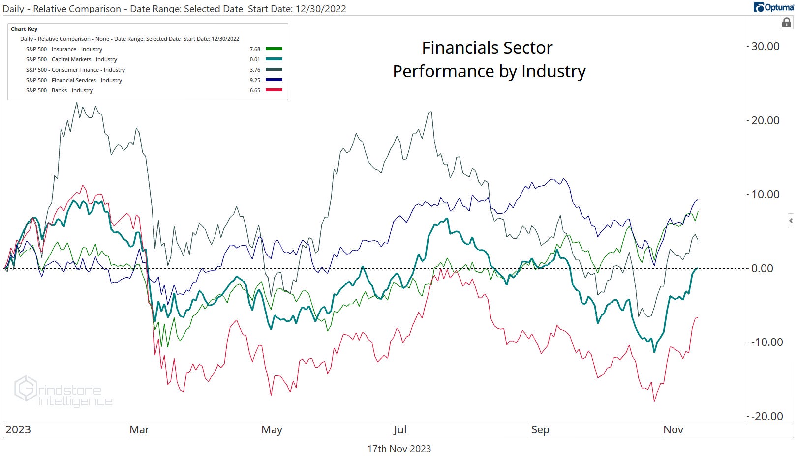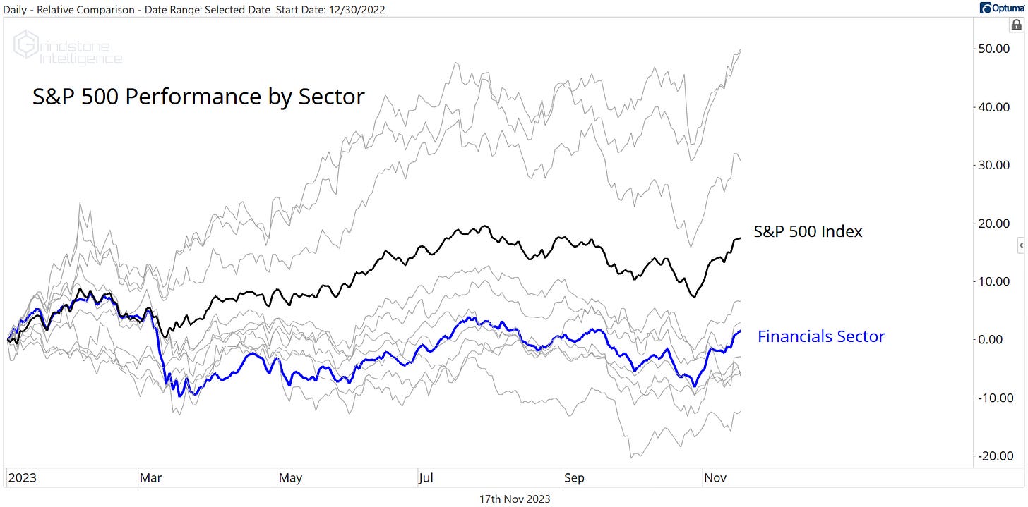 The Financials sector overall is virtually flat for the year, and no sub-industry embodies that truth better than the Capital Markets. They’ve risen a whopping 0.01% for 2023.