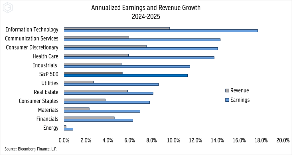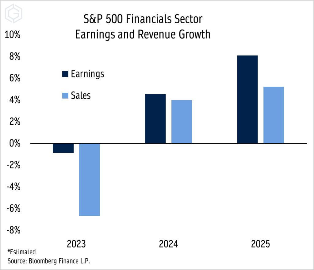 If you’re buying the Financials, it’s not because you think they’re going to grow earnings in an outsized way. Earnings in 2023 are on pace to decline about 1%, with sales down about 7%. Next year, both sales and earnings are expected to rebound at a modest mid-single digit pace before earnings growth reaches a more respectable 8% in 2025.