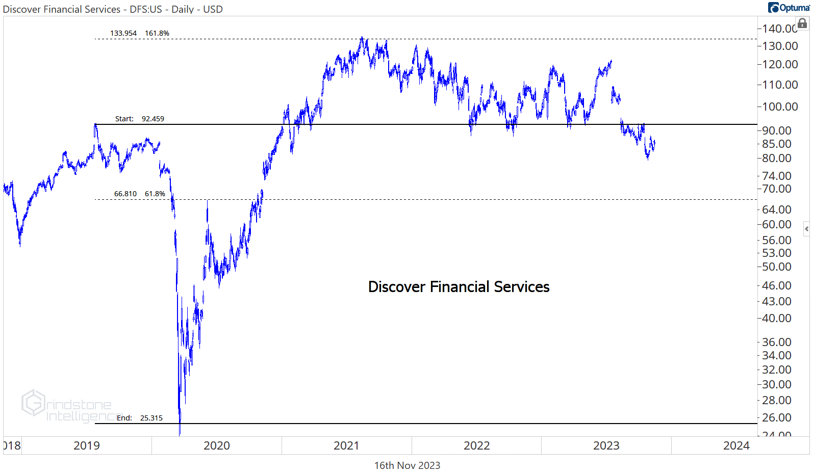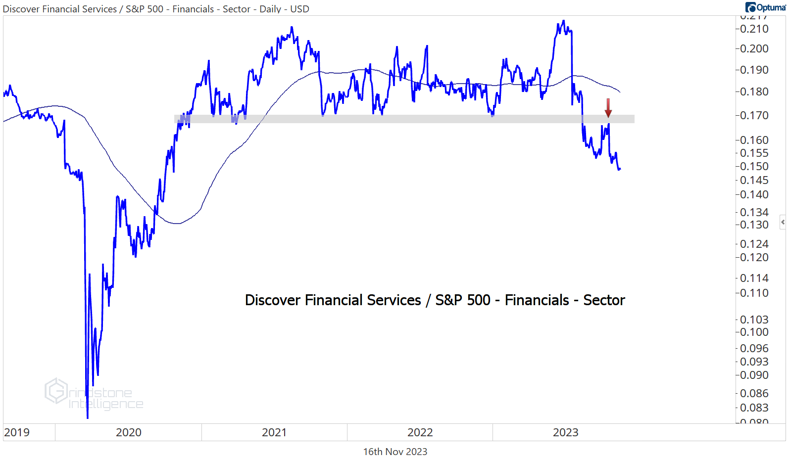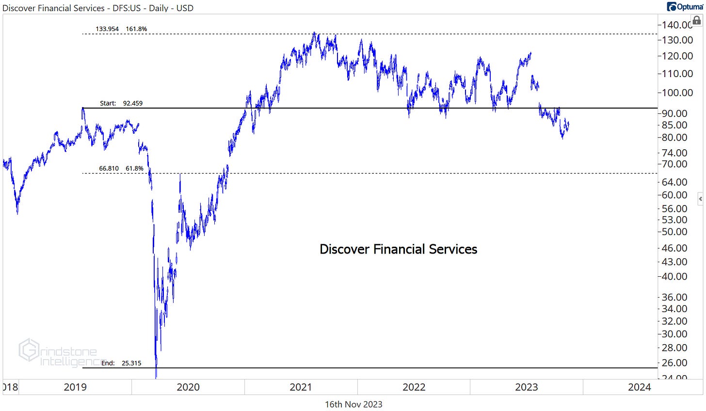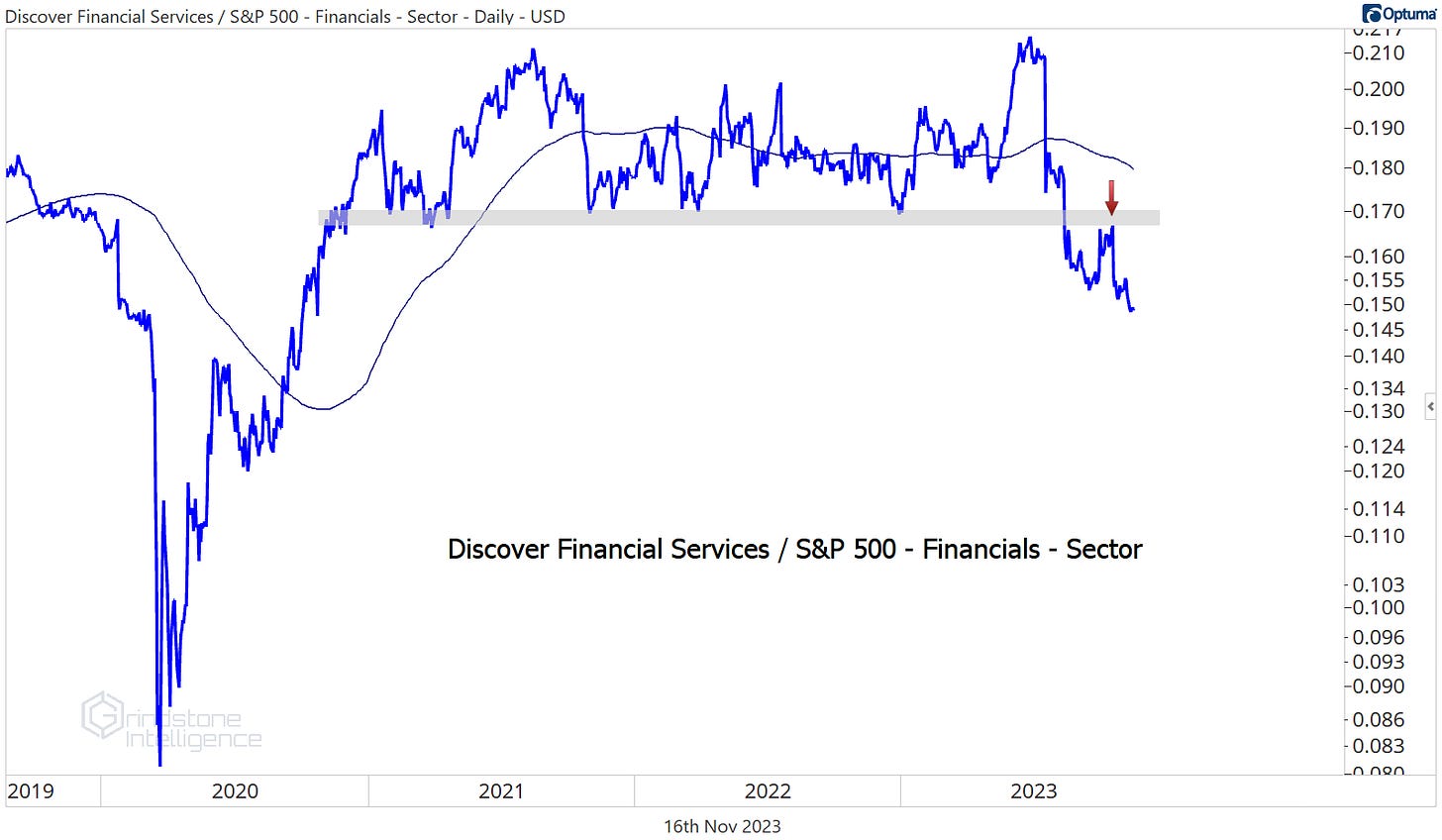 Discover was the worst stock in the sector over the last month, but we aren’t buying the pullback. DFS is below the 2019 highs, which was a key support level all throughout 2022 and the first half of 2023. Now, that former support will act as stiff resistance on any rallies.