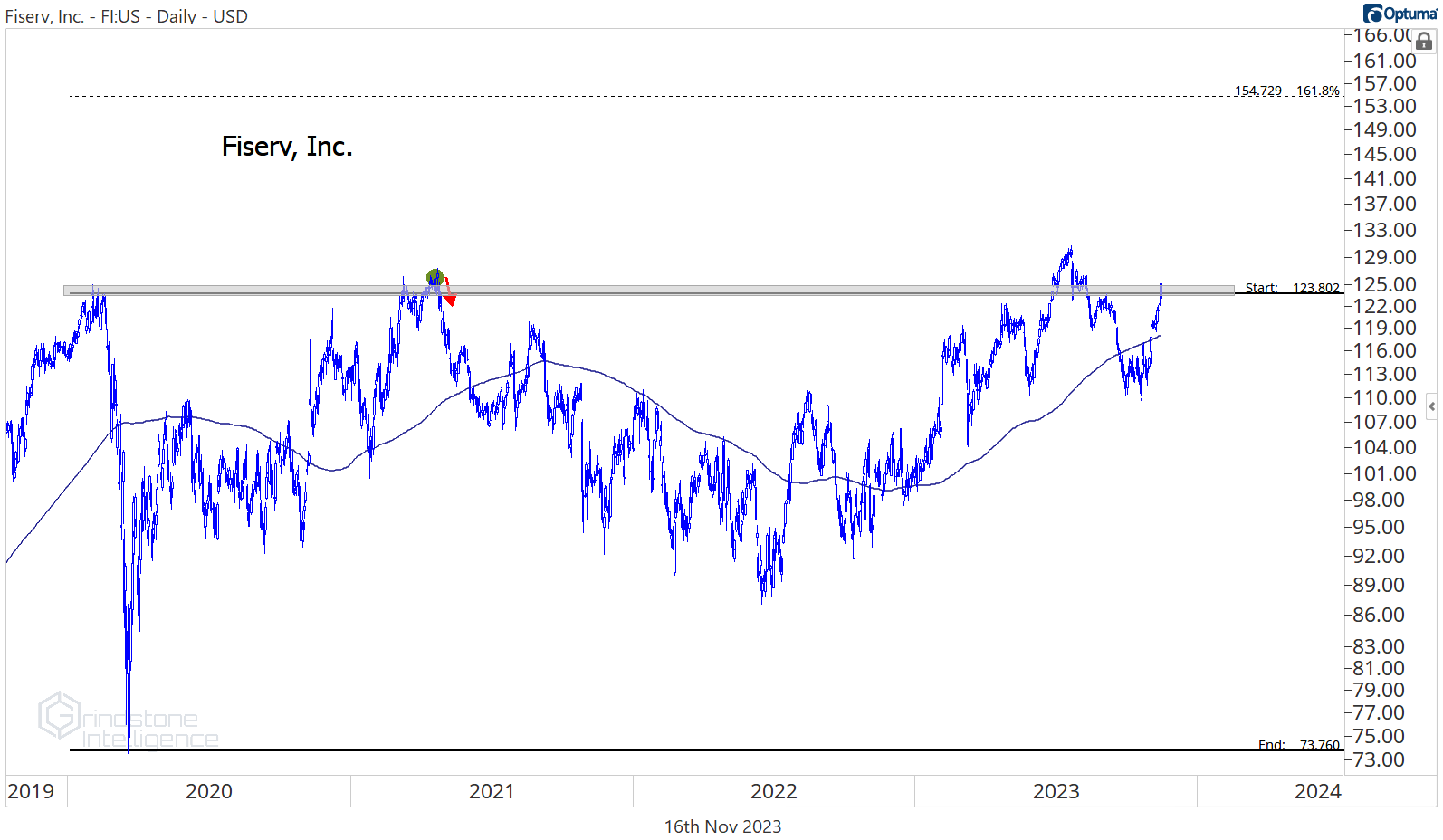 We’ve been watching Fiserv as it tries to break out of a multi-year base. FI was one of the best uptrends you could find in the decade leading up to COVID, and now it’s had some time to digest all those gains. The first attempt to get going this summer resulted in a failed move, but after the false start, FI is making another challenge of the former highs. We want to be long above $123 with a near-term target above $150.