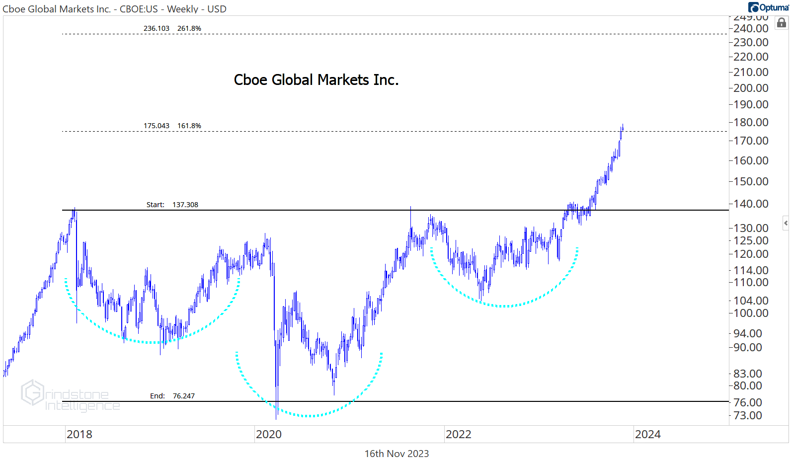 Cboe has been much better than that, though. We’ve liked the stock since it broke out above $137, and we had a target of $175, which is the 161.8% retracement of the 2018-2020 decline. Now that our target has been hit, we want to see how it responds to this potential area of resistance.