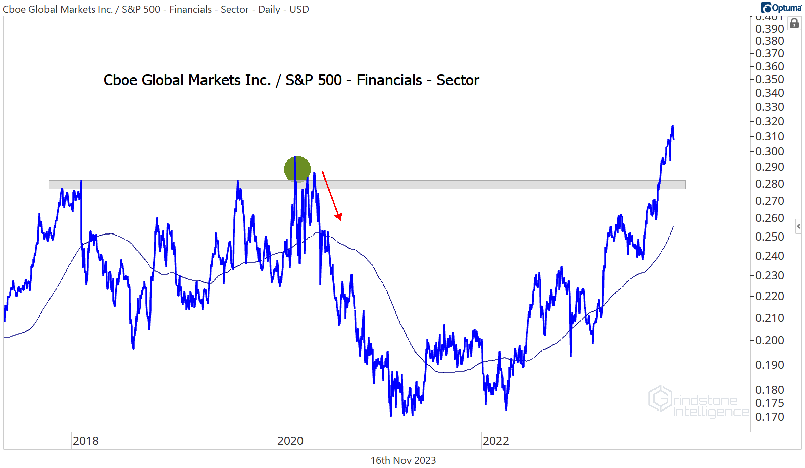Based on the stock’s relative strength, we’re inclined to believe that CBOE will eventually head higher. It just broke out of a 5-year base relative to the rest of the Financials. If you want to outperform, you need to own the things that are outperforming - like this. Some near-term trouble is to be expected here, but if CBOE is above $175, we can be long with a target of $235.