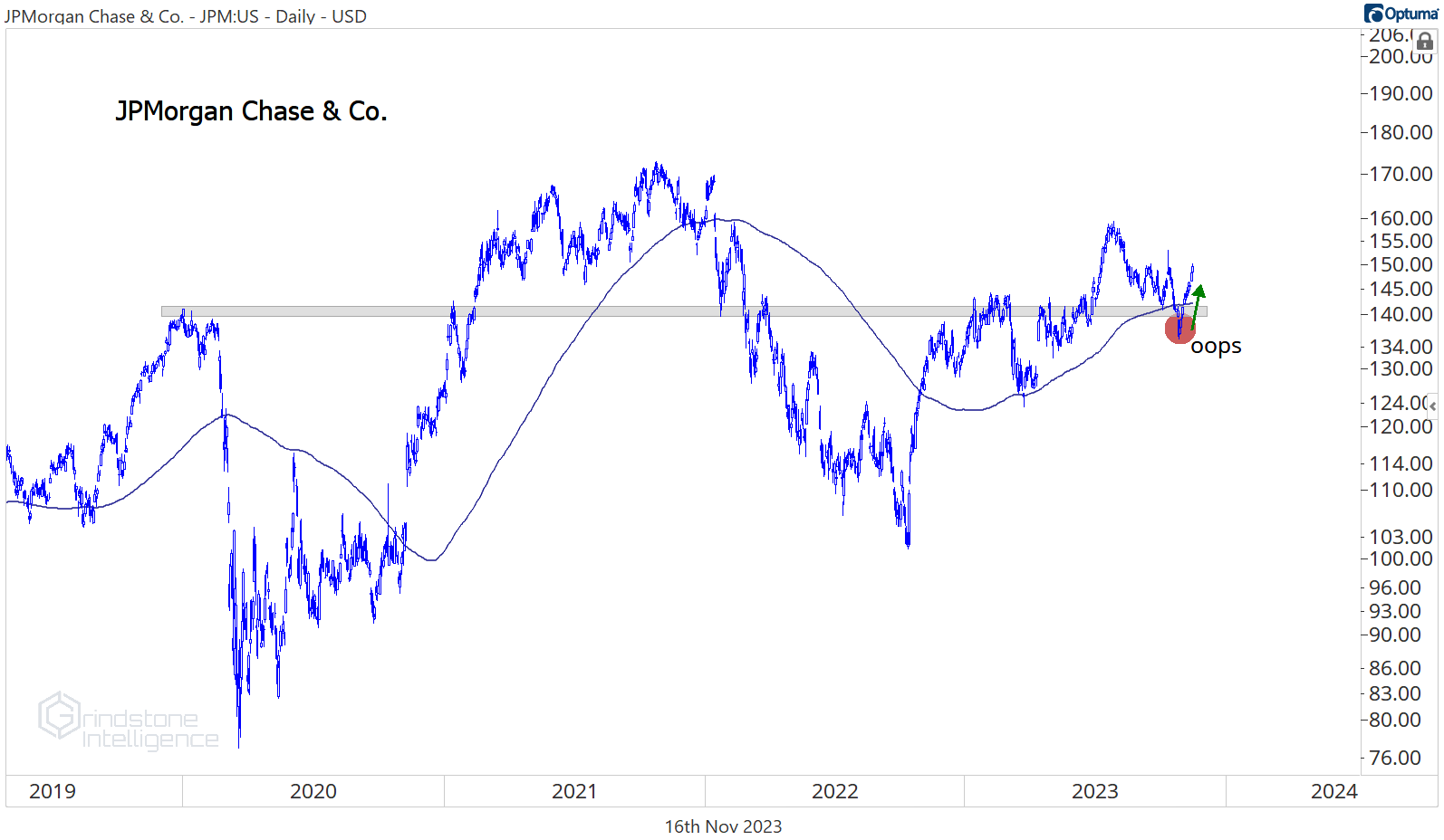 Sorry bears, but you had your chance. I can’t think of any stock in the sector that’s more important than JPMorgan - it’s one of the most important stocks in the world for that matter. And you guys had JPM on the ropes a few weeks ago. You pushed it below the pre-COVID highs and knocked it beneath the 200-day moving average for the first time all year. Then you fumbled the opportunity. JPM is back above that key level - and from failed moves comes fast moves in the opposite direction.