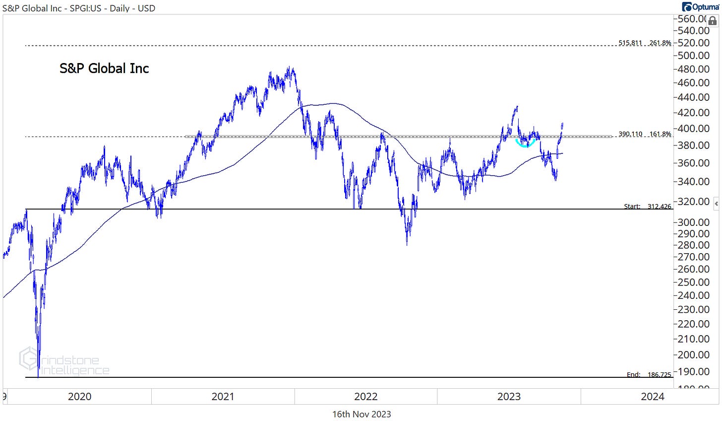 We’ve got a good setup in S&P Global, which was among the best performers over the last 4 weeks and sits near the top pf the year-to-date leaderboard. For this one, we only want to be long above $385, with a target of $515, which is the 261.8% retracement from the COVID selloff.