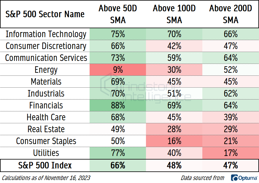Right now, more Financials stocks are above their 50-day moving average than any other sector. The number above their 100 and 200-day moving averages is also better than the overall S&P 500. There’s a lot of long-term trend damage to repair still, but the Financials are well on their way.