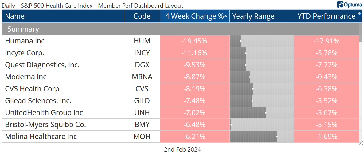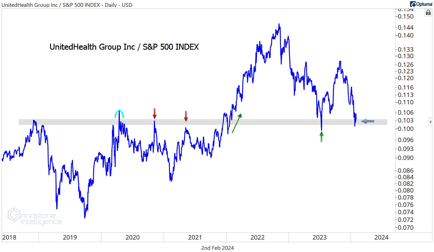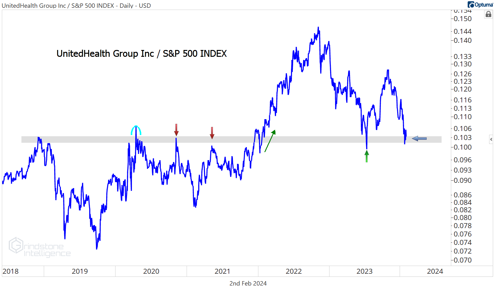 The managed care space ran into some trouble over the last month, led by a $20% decline in Humana after they guided 2024 EPS to be far below expectations. Peer UnitedHealth was dragged down with them, but the decline presents a compelling setup for UNH when compared to the S&P 500. The UNH/SPX ratio is right back to where it bottomed in mid-2023 - the same place it peaked from 2018-2021.