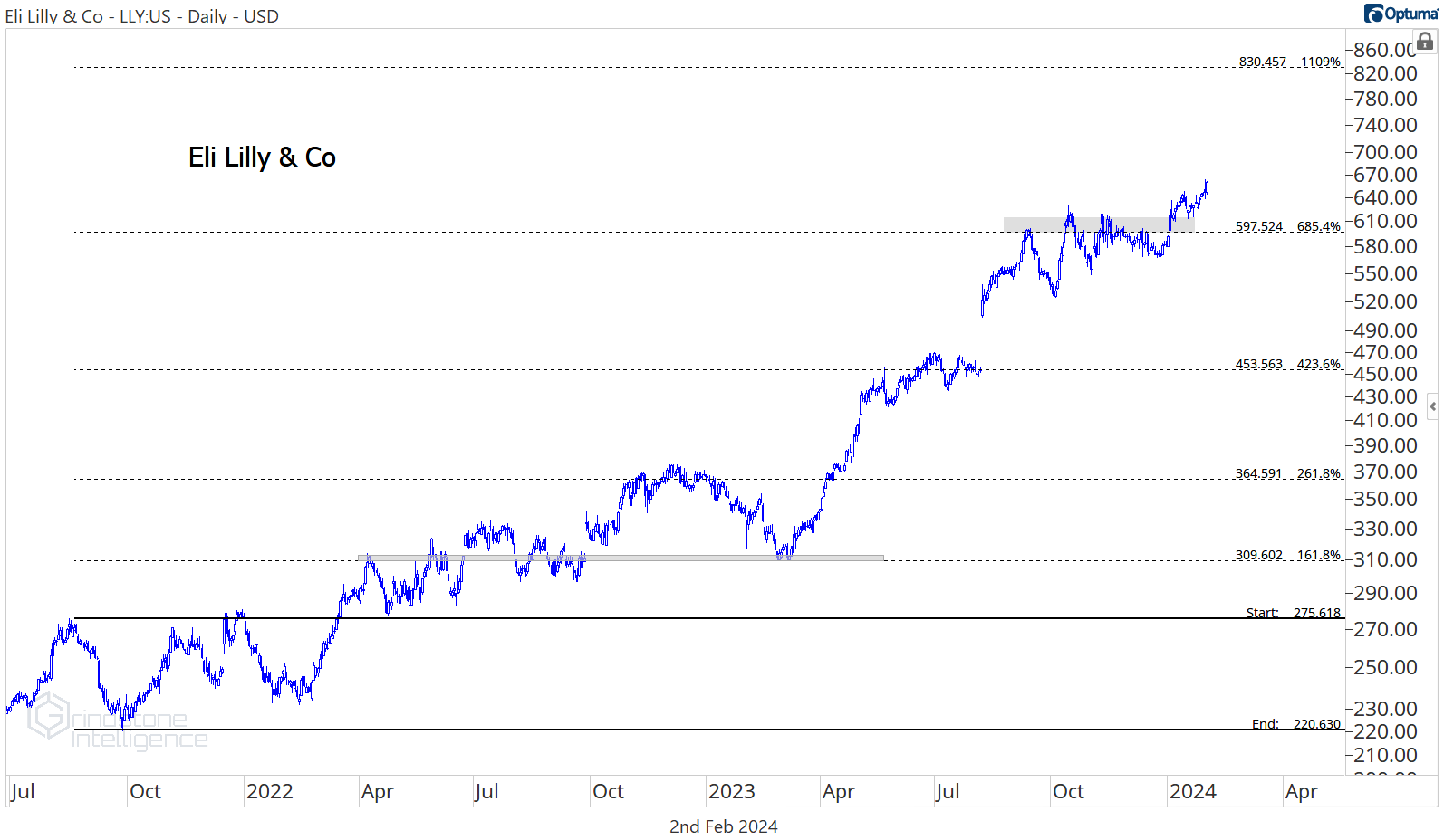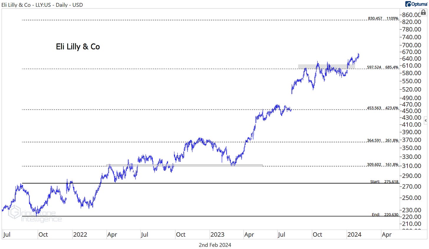 Eli Lilly’s 5-month consolidation resolved higher, and we’re maintaining our target of $830, with support down at $620.