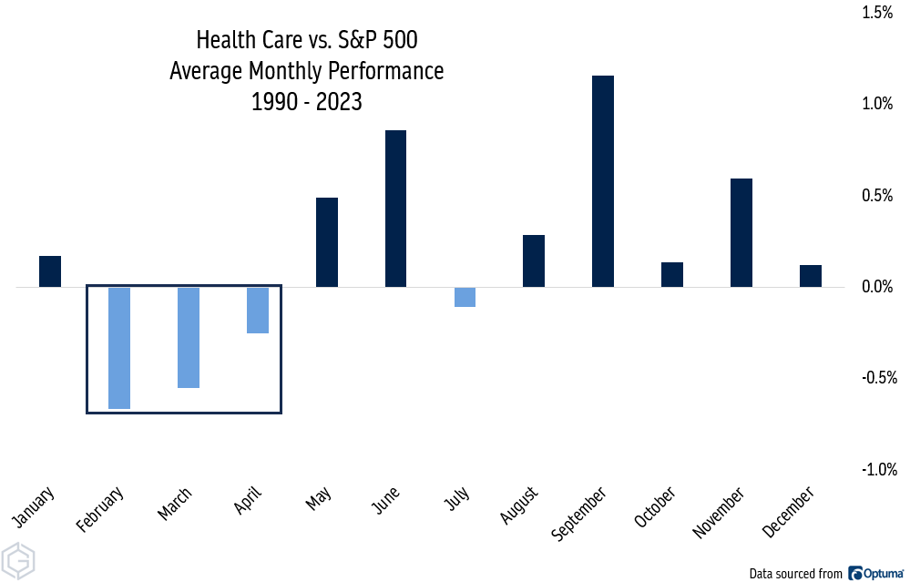 And on a relative basis, the weakness extends throughout the next quarter. Health Care has lagged the rest of the S&P 500 by 0.67% on average in the month of February since 1990, and by 0.55% in March.