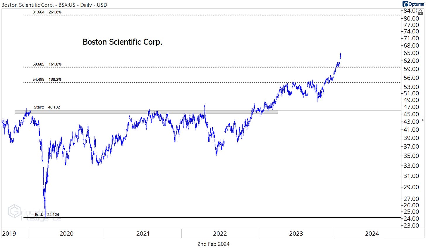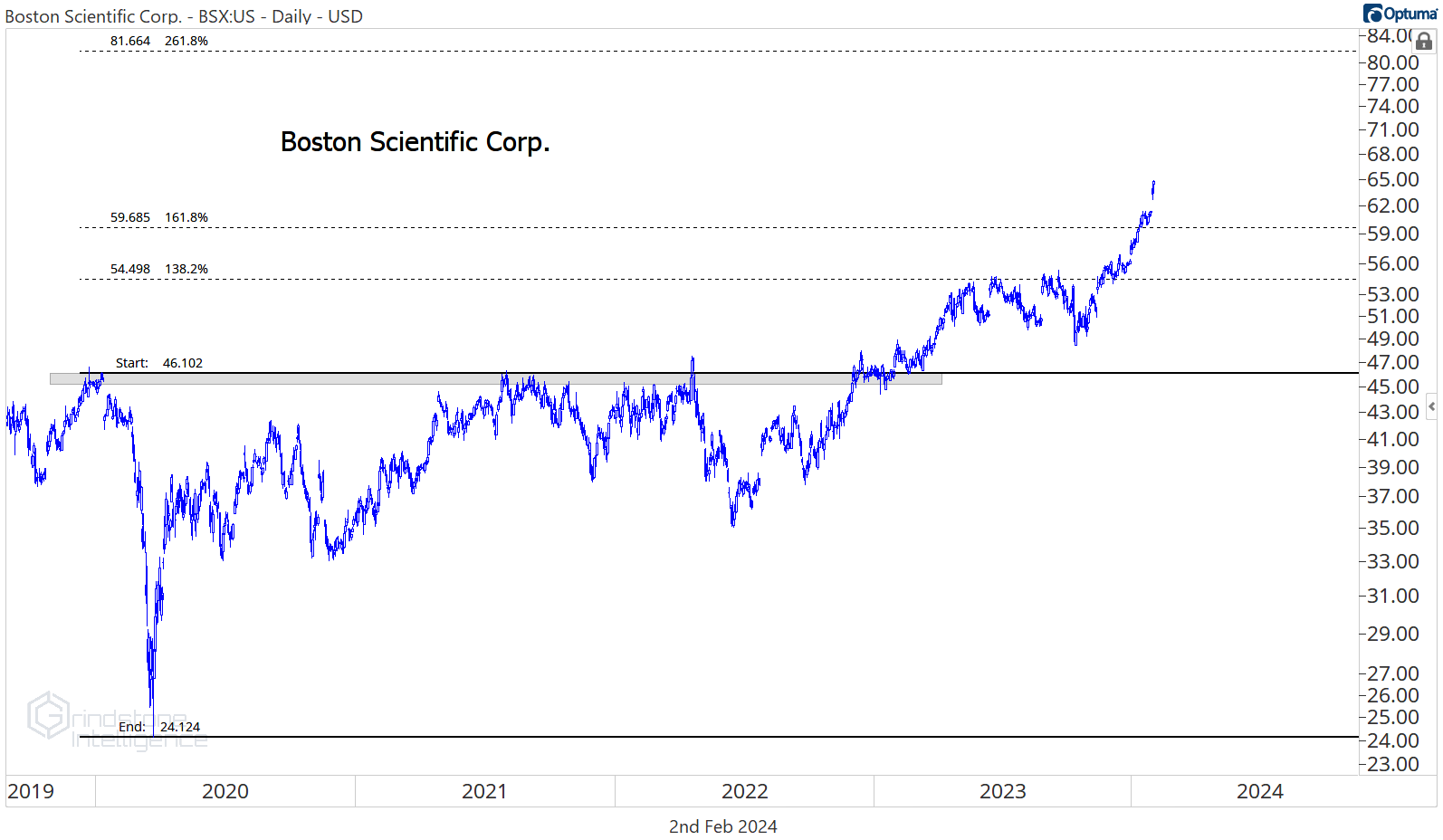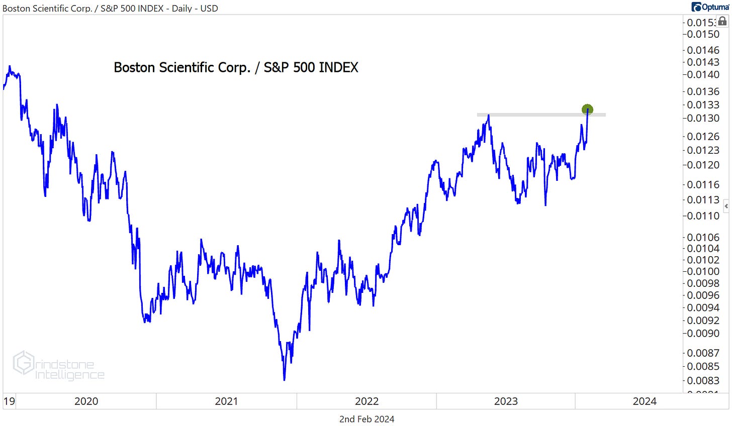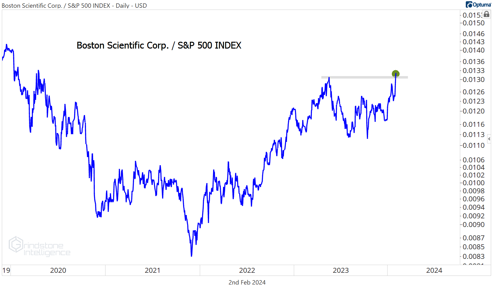 Boston Scientific isn’t just showing relative strength vs. rest of Health Care. It’s breaking out against the entire S&P 500 index.