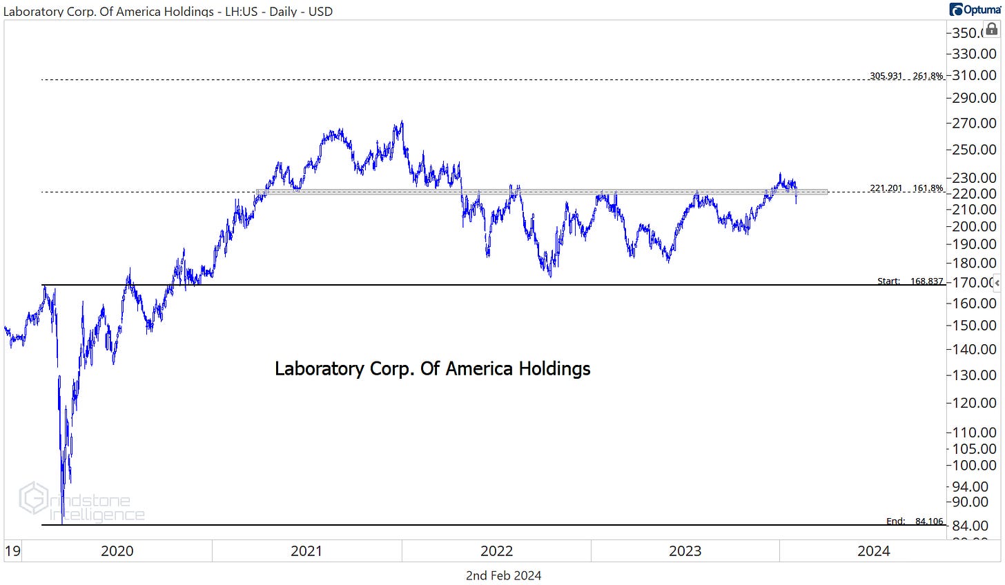 LabCorp is one of the cleanest risk-reward setups in the sector. We only want to be long LH if it’s above $220, which is the 161.8% retracement from the 2020 selloff. Our target is the next key Fibonacci retracement level at $305.