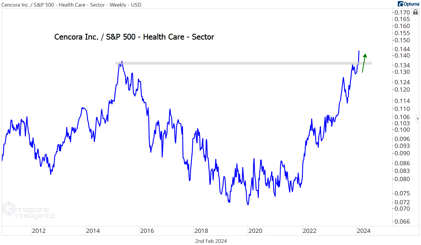 As if the gains COR has made weren’t impressive enough, the latest surge pushed the stock to new highs vs. the rest of the Health Care sector, too, putting the cap on a 9-year base.
