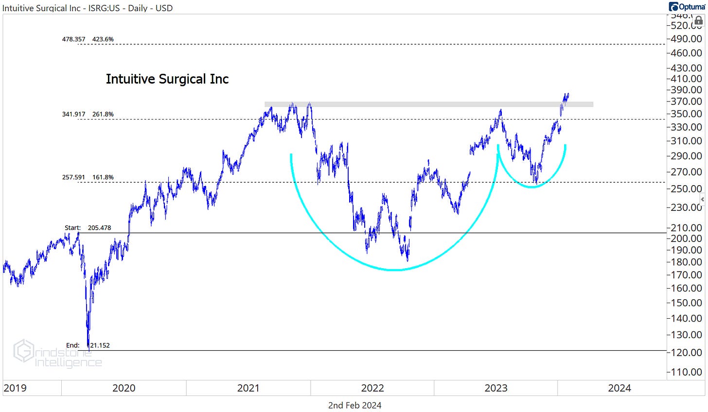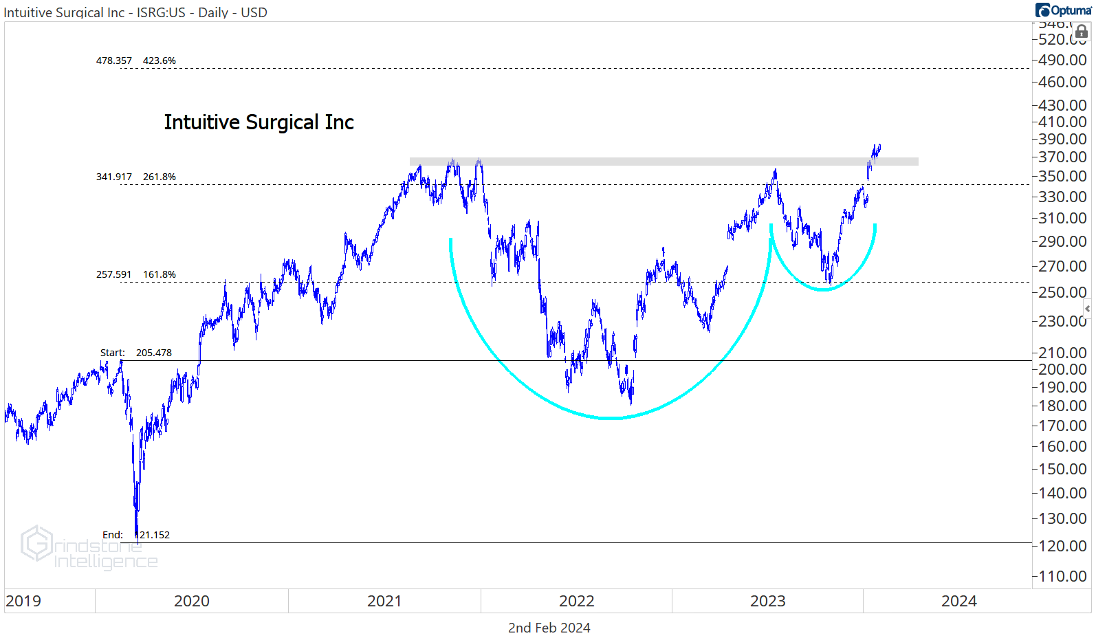 Intuitive Surgical has risen nearly 20% over the last 4-weeks, completing a 2-year cup and handle continuation pattern.