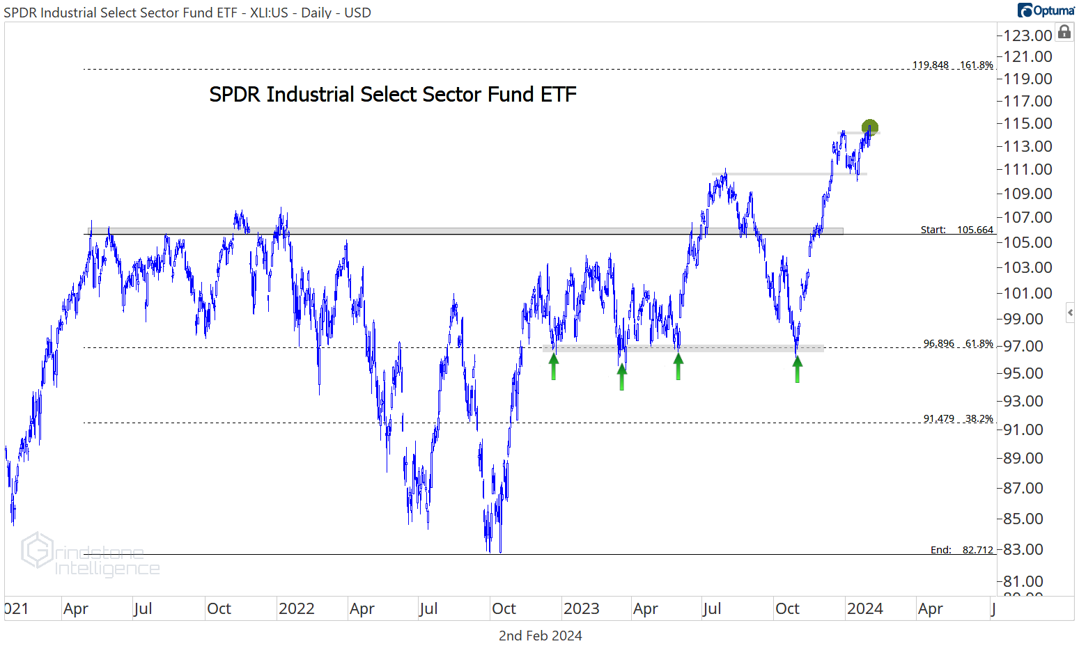 Perhaps that doesn’t impress you. After all, the Industrials were the first sector to set new highs last year, and they’re now 7% above the bull market peak set back in 2021. this latest breakout is just a continuation of that strength.