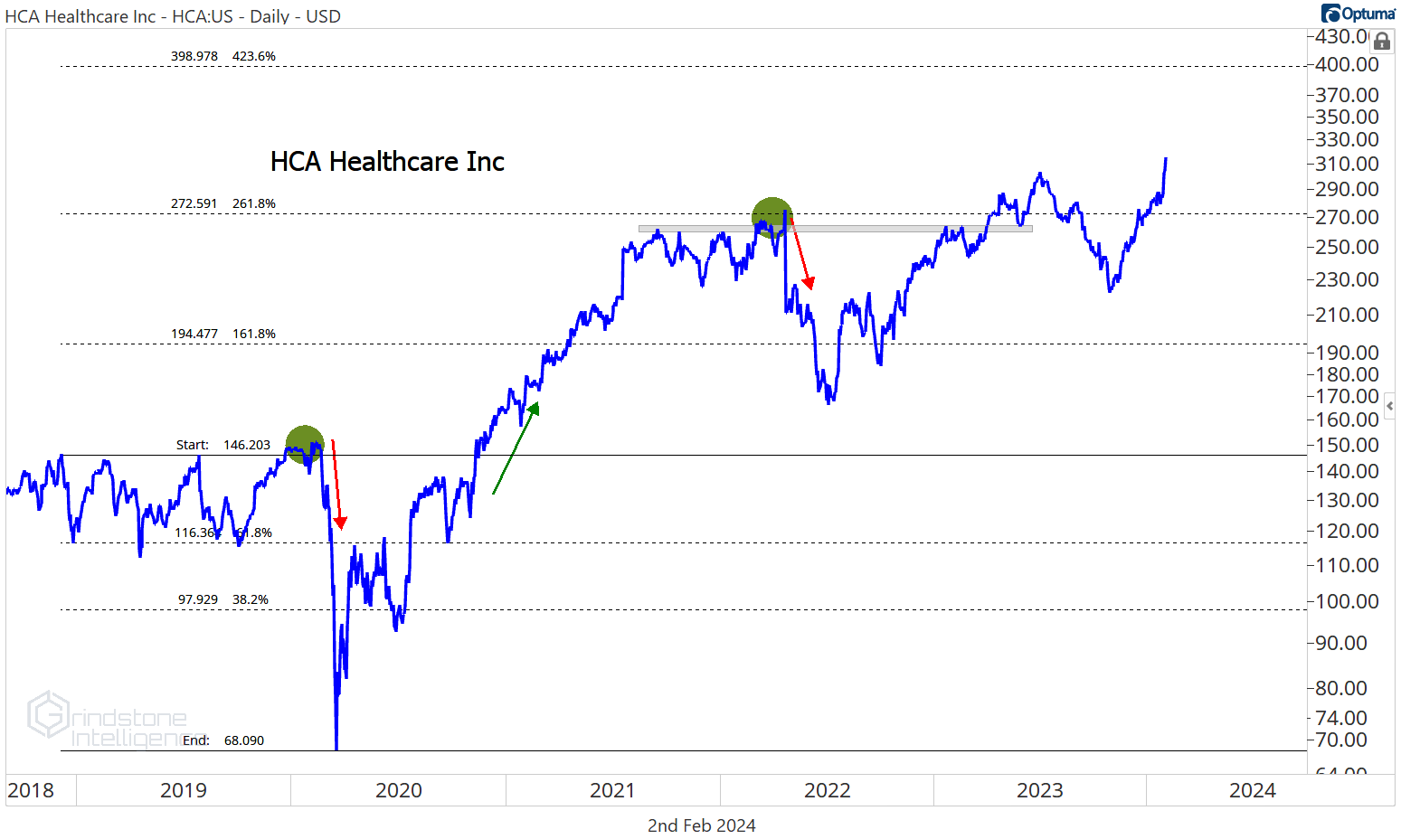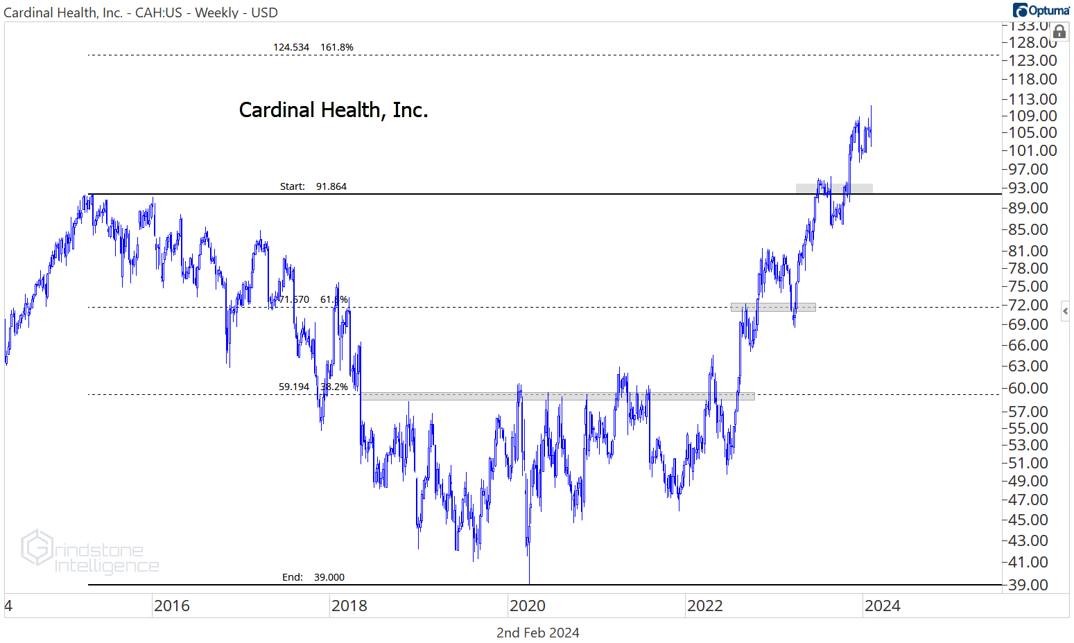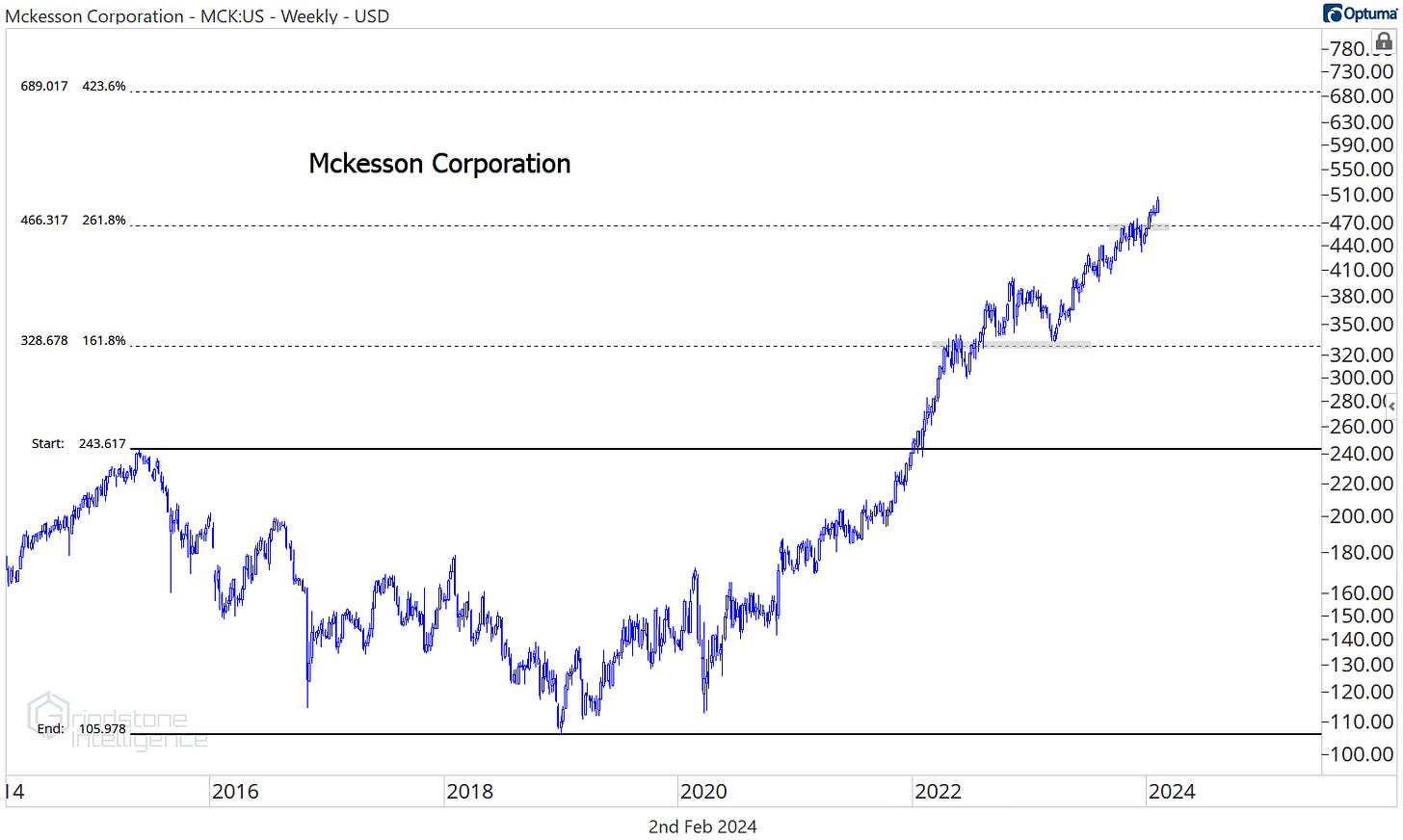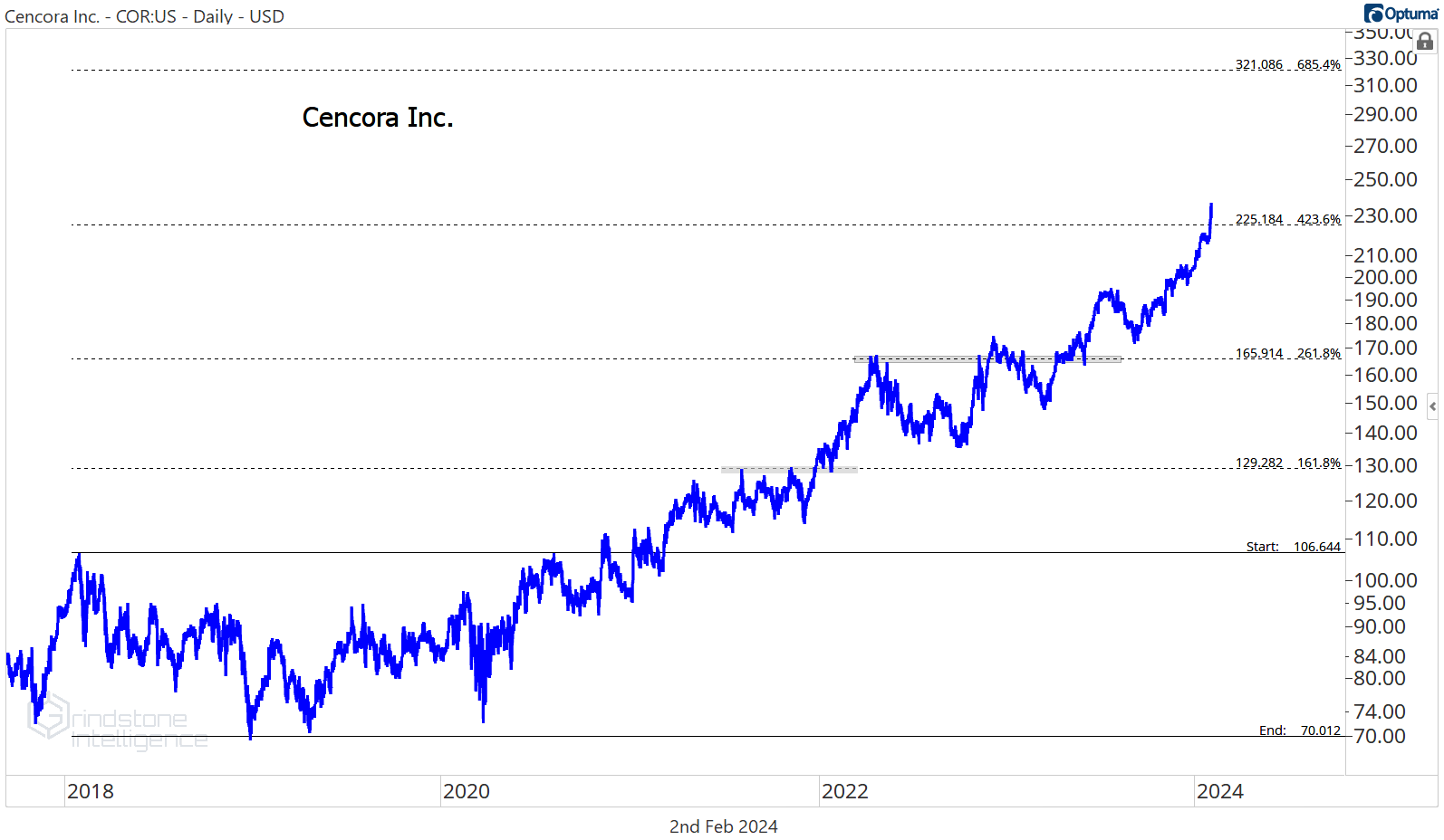 Cencora was the one we were more cautious on as it approached our target of $225, but it blew past that target earlier this week, and now we want to use that former target to manage downside risk. As long as COR is above $225, we can be long with a new target of $320, which is the 685.4% retracement from the 2018-2020 range.