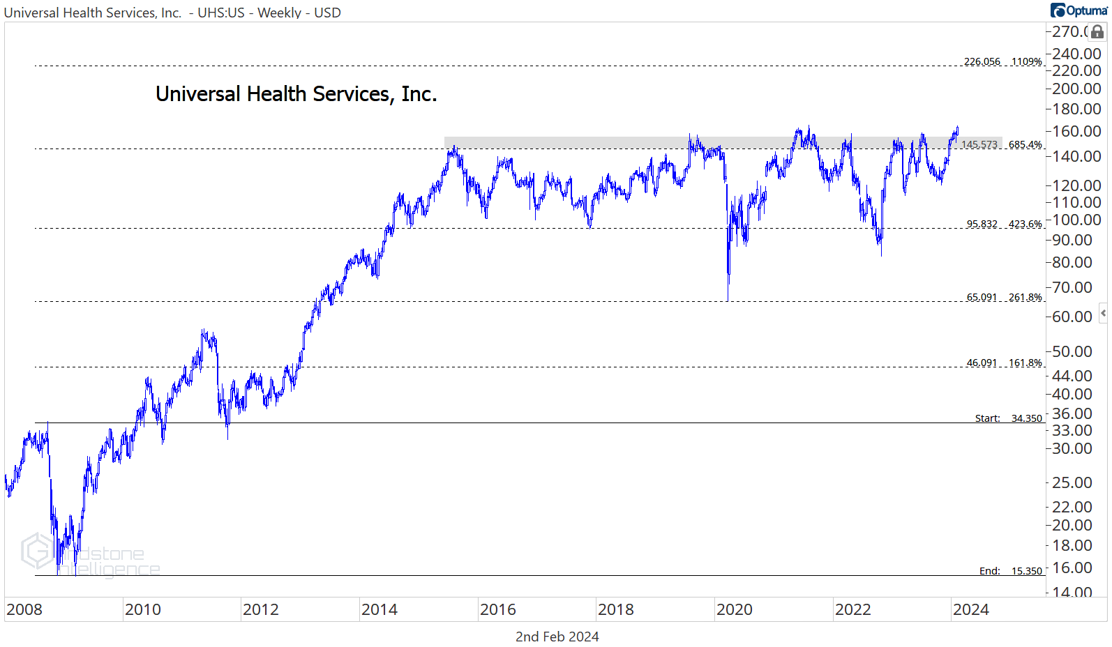 The risk/reward setup is even better in UHS. Universal Health Services has gone nowhere for nearly a decade. From big bases come big resolutions. We need to be a little careful with big, messy consolidations like this - sometimes the breakouts can be just as messy - but if UHS stays above $160, we like it long with a target of $225.