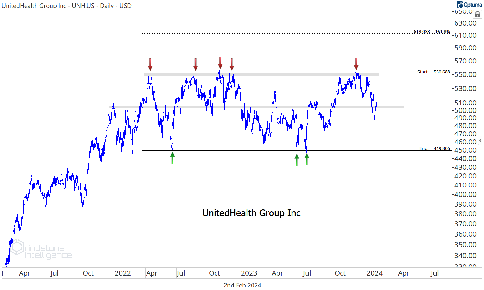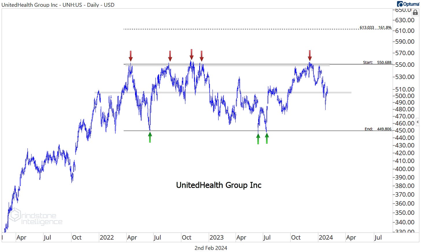 This is a rangebound stock to be sure, and one that we’d normally leave alone. But the relative strength profile intrigues us. We think the idea of owning UNH on a tight leash above $505 with a target of $613 makes sense here.