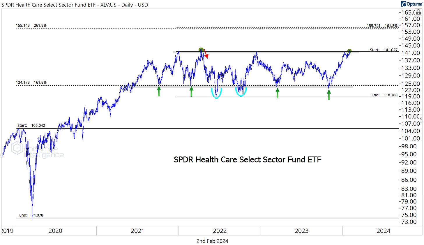 Our target here on the XLV is $155, which is both the 261.8% retracement from the 2020 decline and the 161.8% retracement from the 2021-2023 range.