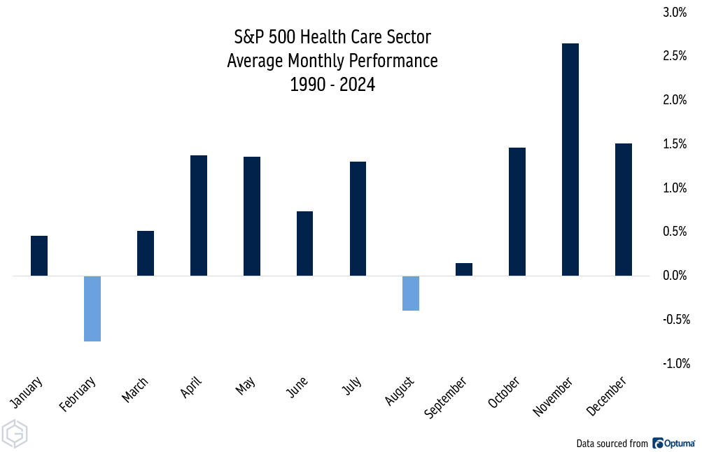 But remember that seasonality is a general guideline, not a prescription. Even in those two months, where the sector has underperformed the S&P 500 most consistently, Health Care has still won out a third of the time. This year could easily be the ‘one’ in the one-in-three.