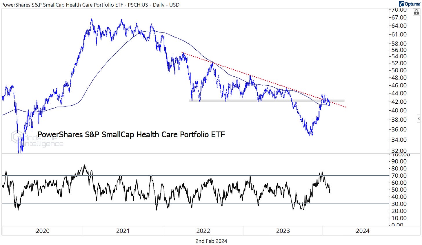 Right now, though, PSCH is above its 200DMA, threatening to break a 2-year downtrend line, challenging overhead resistance from the 2022 lows, and just saw momentum reach its highest level in 3 years. A sustained break above $43 would be confirmation that Health Care stocks are an area of strength.