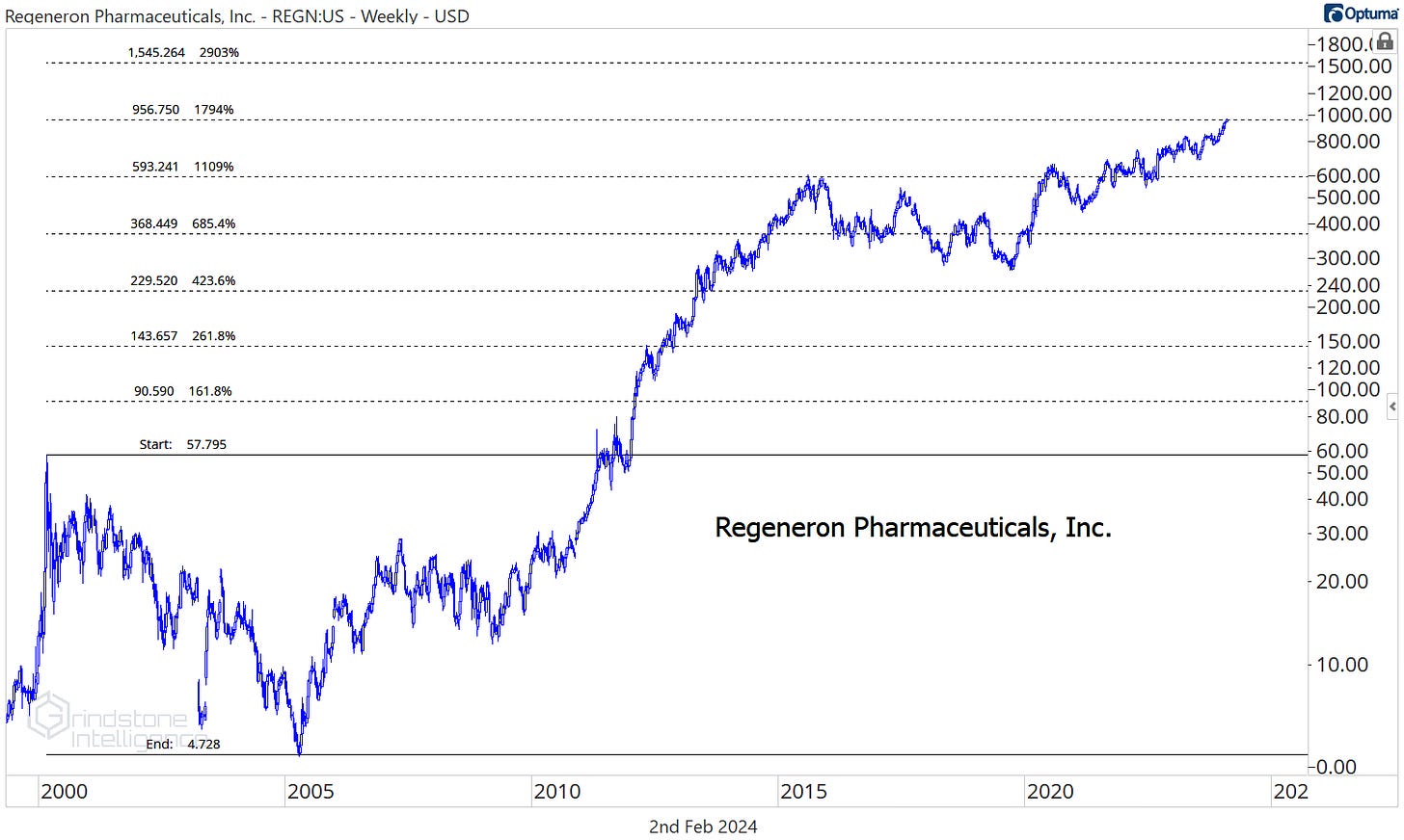 We’re zooming out a lot on this one, all the way back to 2000. The 1794% retracement from the 2000-2005 collapse is at $956, right where we’re trading today. This is not the place for new long positions, since we could easily see several weeks, months, or even years of consolidation here. After some consolidation, though, we’d like to own REGN above $956 with a target of $1500.