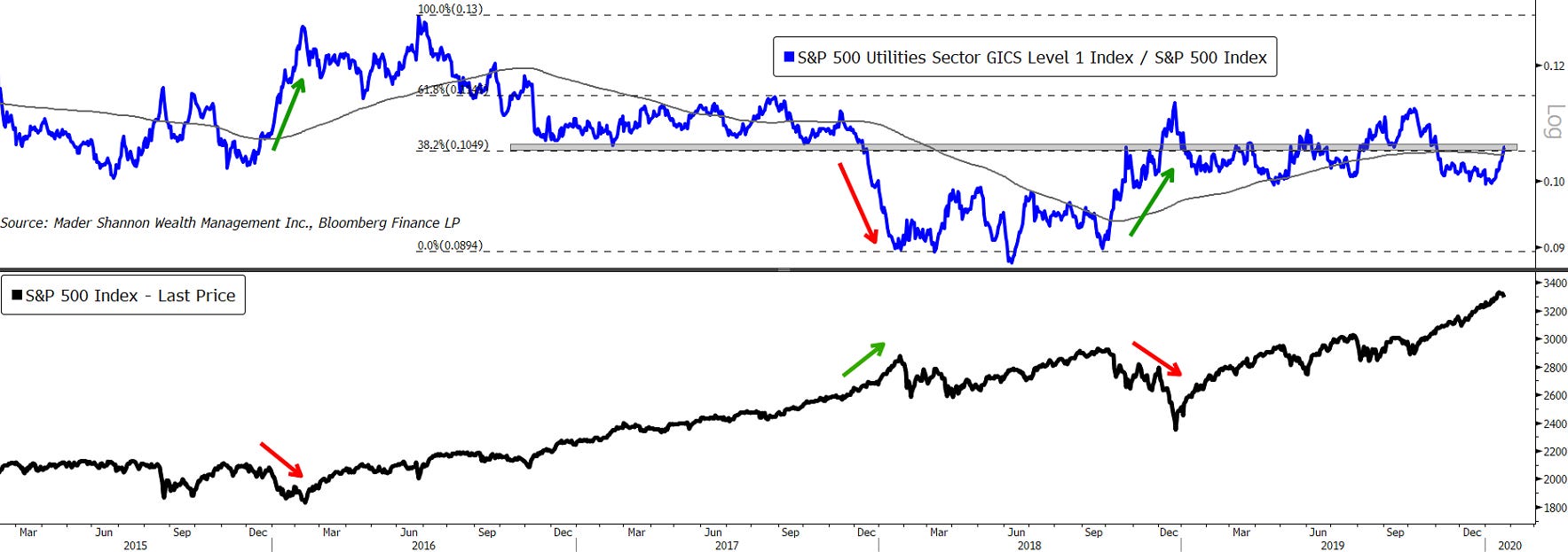 While the last few weeks of outperformance don’t appear unusual on the chart above, the manner in which they’ve outperformed, is. Traditionally a safe-haven sector, Utilities tend to lead when the broader market weakens, and generally lags when larger, risk-on sectors strengthen. Here’s how the ratio looks when we compare it to the S&P 500.