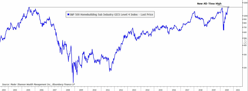 The recession has done little to slow a red-hot housing market. In fact, it may have strengthened it. The S&P 500 Homebuilding index just hit a new all-time high this week – its first since 2005.