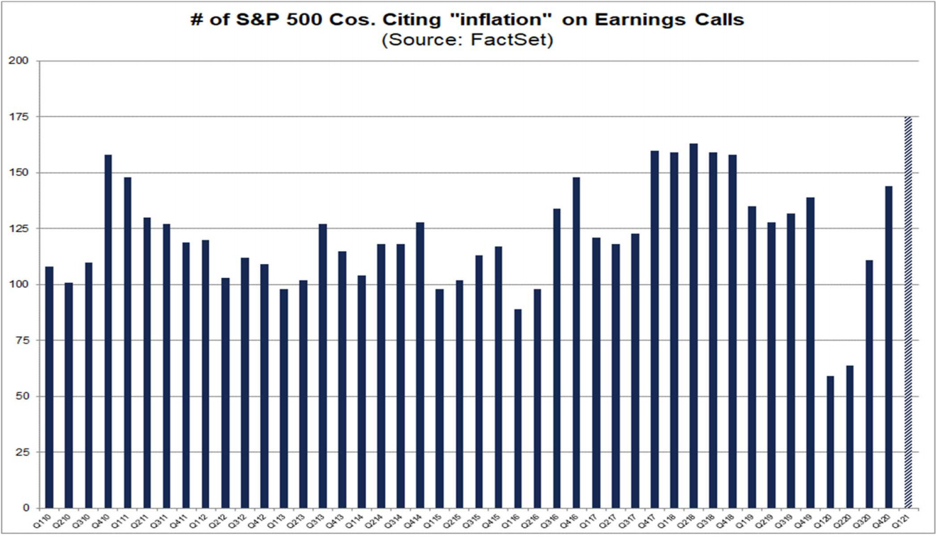 The future may well depend on businesses’ willingness to protect margins and raise prices – and consumers’ willingness to pay them. We’ve been carefully tracking inflation-linked commentary from company executives over the last three quarters, and it seems we’re not the only ones. According to FactSet, the term “inflation” has been used on more earnings calls this quarter than in any period since at least 2010.