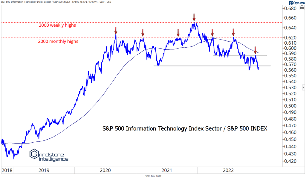 The chart below is one of our favorites, and if you’ve followed our work you’ve probably seen it before. It’s the ratio of the S&P 500 Information Technology sector vs. the S&P 500 index. We laid out the reason we like it so much in our December note: