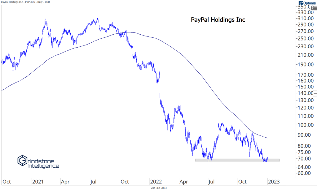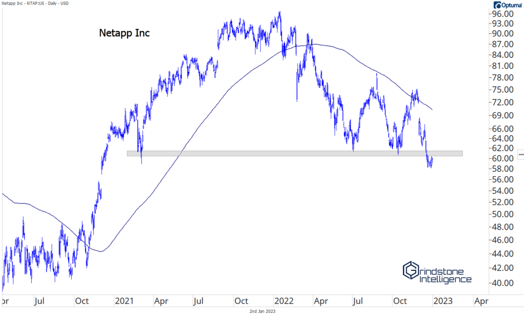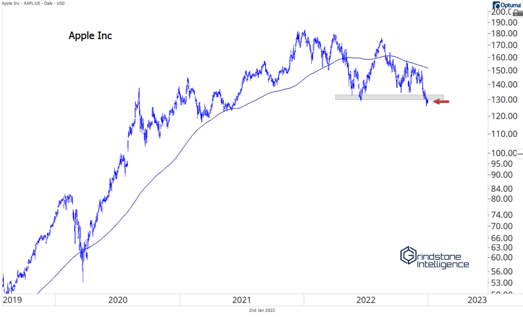 Apple has the biggest weighting in the group, and it spent most of 2022 holding the sector up. Now it’s breaking down to new 52-week lows. If there’s one thing we know about new lows, it’s that they aren’t bullish.
