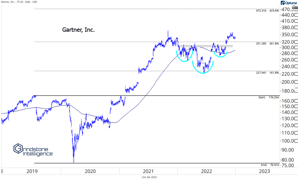 Not all of Tech is that dark, though. There are some bright spots. We called out Gartner last month, and it continues to be on our radar because of its relative strength. As long as this name is above 320, we like it with a target up near 470.