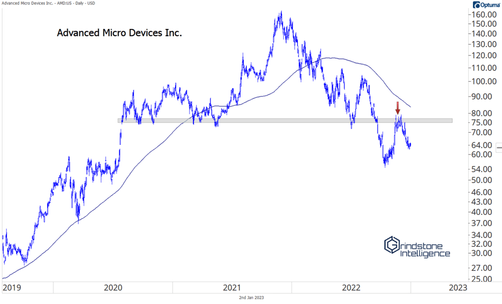 Semiconductors had rallied in November, making us think that maybe this Tech selloff had run its course. But semis broadly got rejected by their prior year lows, and they’re still stuck solidly below resistance. AMD is a great example: