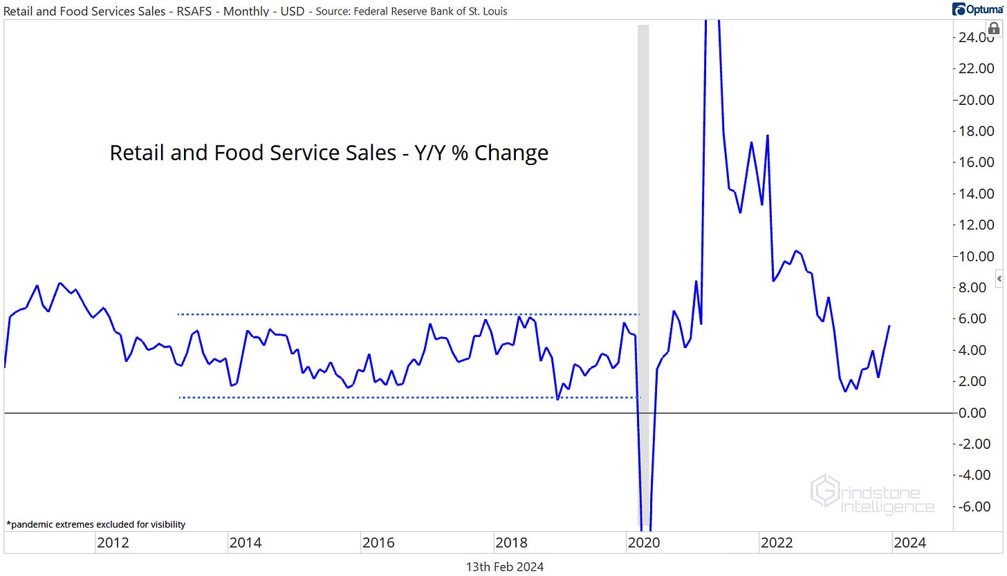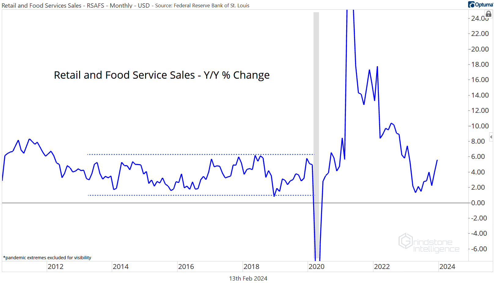 We have strong consumer spending to thank for the resiliency. Consumption accounts for about two-thirds of the US economy, and retail sales in December rose to nearly 6% - the highest since last February, and near the high end of where retail sales oscillated between 2013-2019. Adjusted for inflation, December’s print was the best since February 2022, when consumers were still riding high from pandemic-era stimulus checks.