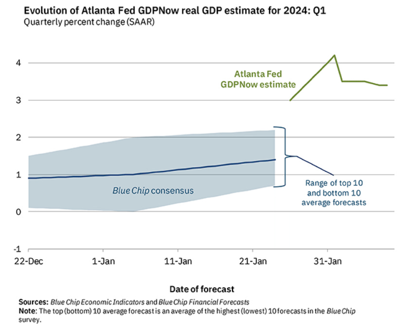 But the US economy keeps outperforming expectations. GDP grew at a 4.9% rate in Q3 2023 and 3.3% in Q4, despite overwhelming predictions for a downturn. And if recent data is any indication, the first quarter of 2024 will be just as healthy. The Atlanta Fed GDPNow real GDP estimate for Q1 is at 3.4%, more than double the Blue Chip consensus estimate.