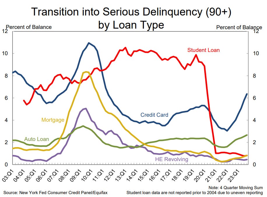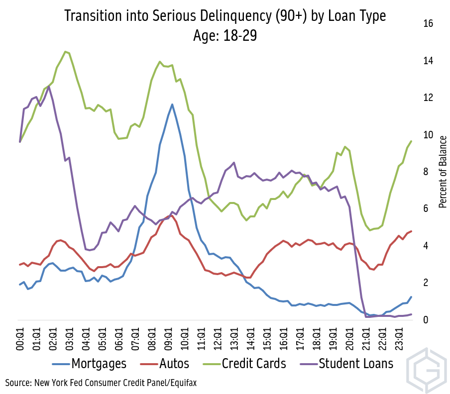 The younger the borrower, the worse things are. For 18-29 year-olds, delinquencies are setting new incremental highs for credit cards, auto loans, and mortgages. That’s before we’ve even felt the full weight of student loan payment resumptions.
