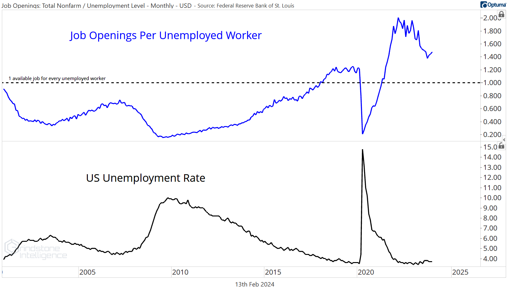 The strong consumer is fueled in large part by a strong labor market. Yes, job cut announcements have dominated the newswires (though cuts in January still came in lower than they did the prior year), but the unemployment rate is hanging near 50-year lows at 3.7%, and there are 1.47 job openings out there for every unemployed worker in the labor market. For context, from the start of the data set until the onset of the pandemic lockdowns, the ratio of job openings to jobless never climbed above the 1.25 print set in the ultra-tight labor market of 2019. By this measure, the labor market is 20% tighter than it was back then.
