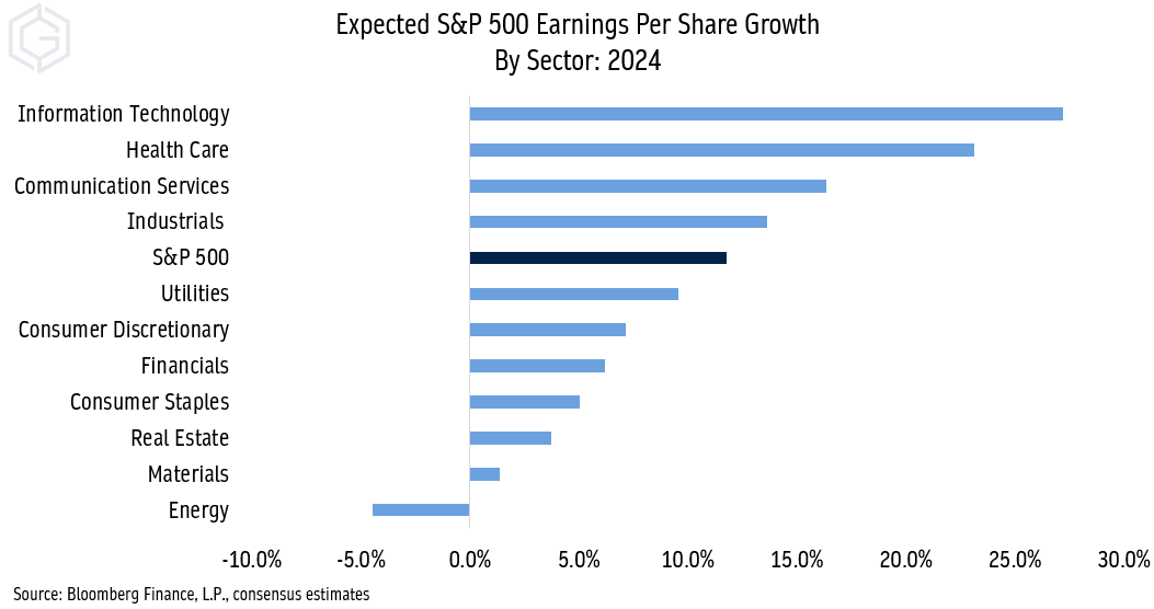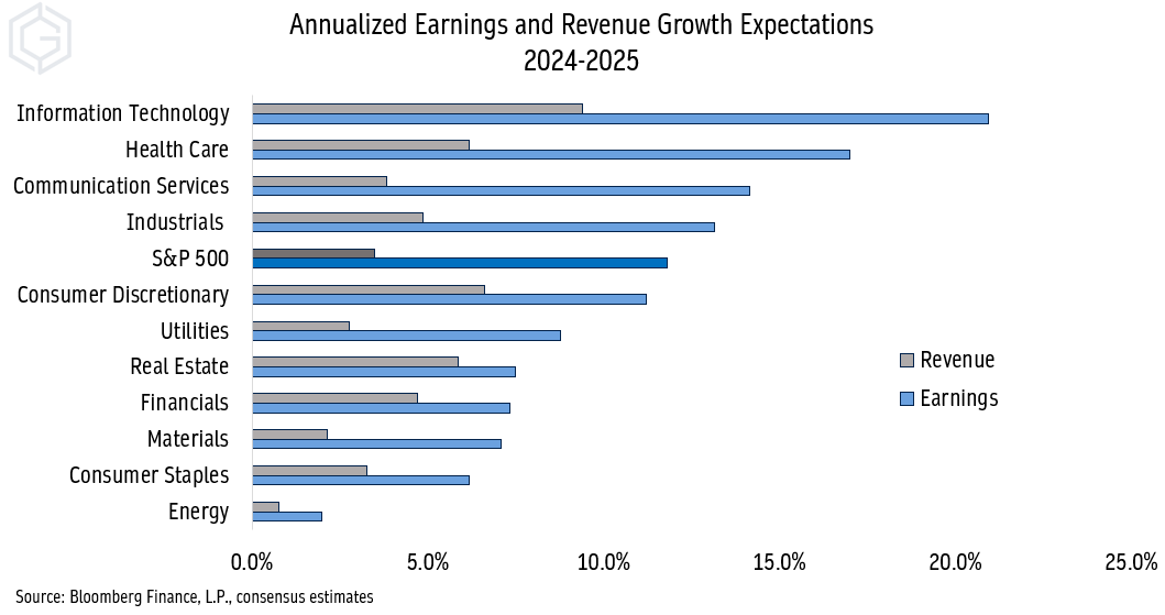 Growth in 2025 is expected to be nearly as strong. If bottom-up consensus estimates are to be believed, earnings for the S&P 500 will rebound at an annualized rate of 11.8% over the next 24 months. We’re led by some familiar names: 21% growth per year from the Tech sector, 17% from Health Care, and 14% from Communication Services.